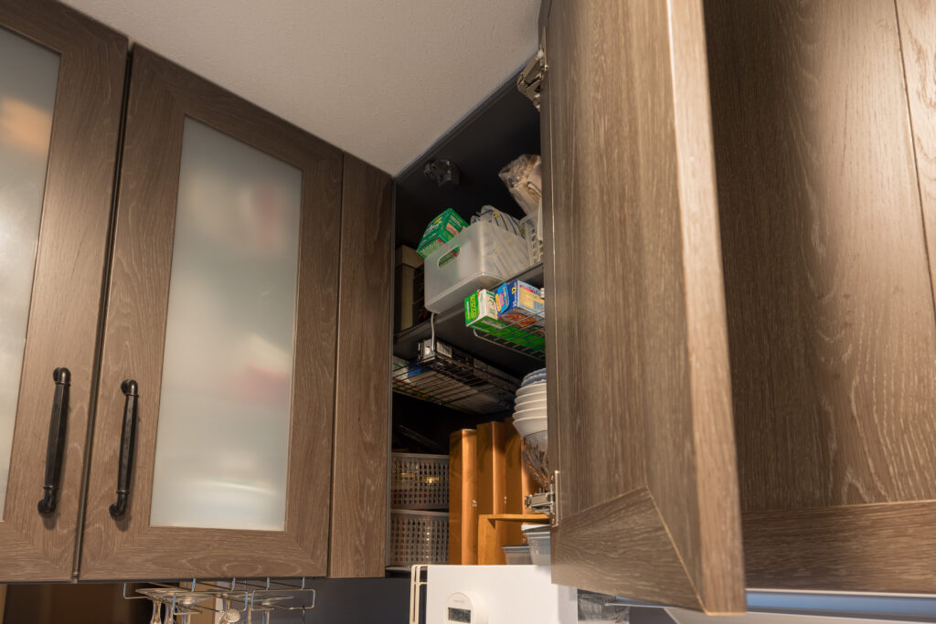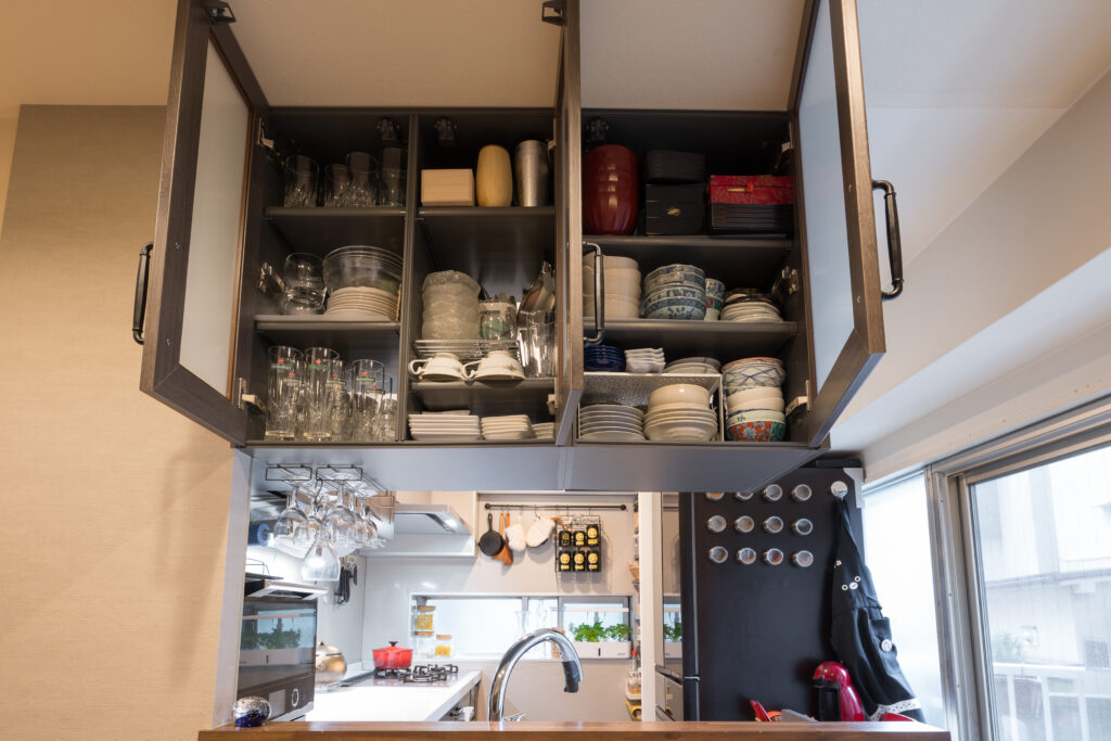 リビングに面した吊戸棚にはグラスや取り皿、お茶碗など、各自がそれぞれ使う食器が収納されていて、使う人が自由に取れるようになっています。