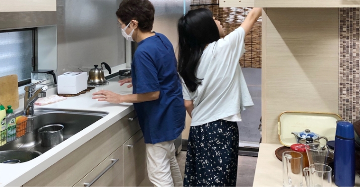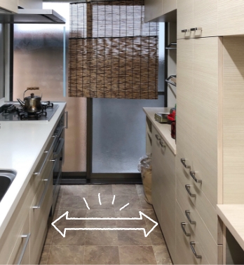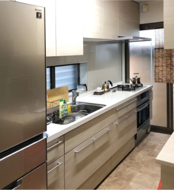 今回のリフォームで一番よかったと感じているのは、通路幅を広くしてもらい、動線を改善してもらったこと。我が家は2世帯。2人が同時にキッチンに立つこともあり、そんな時はお互いに気を使いながら家事をしていました。冷蔵庫がキッチンの奥にあり、料理中は冷蔵庫に何かを取りに行きづらいという問題もありました。そのことを設計士さんに相談したところ、キッチン通路幅を数十cm広げ、冷蔵庫の位置など動線を改善するプランをご提案いただきました。いまでは2人で作業していてもまったくストレスを感じません。広げたのはほんの数十cmなんですよ。たったそれだけでこんなに作業がしやすくなるんですね。