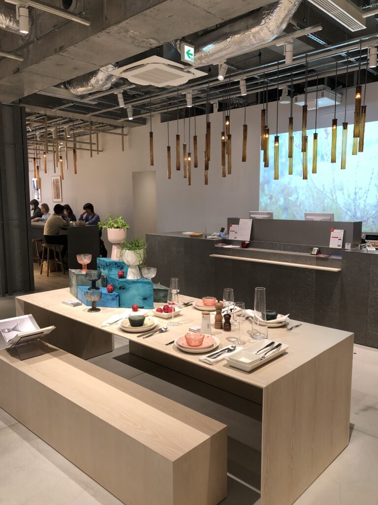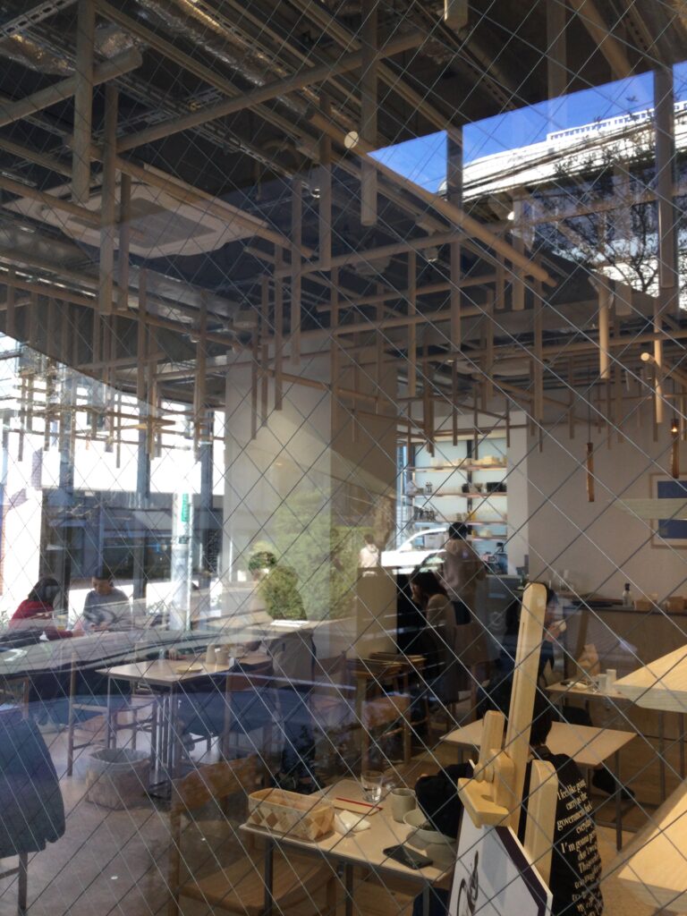 おなじみのコンクリートと木、それにプラスしてガラスが直線的に交わる内装。大人気のカフェのエリアも覗いてみると、なるほど天井から直線が下がっている、氏の建築物独特のあの雰囲気も感じられますね。