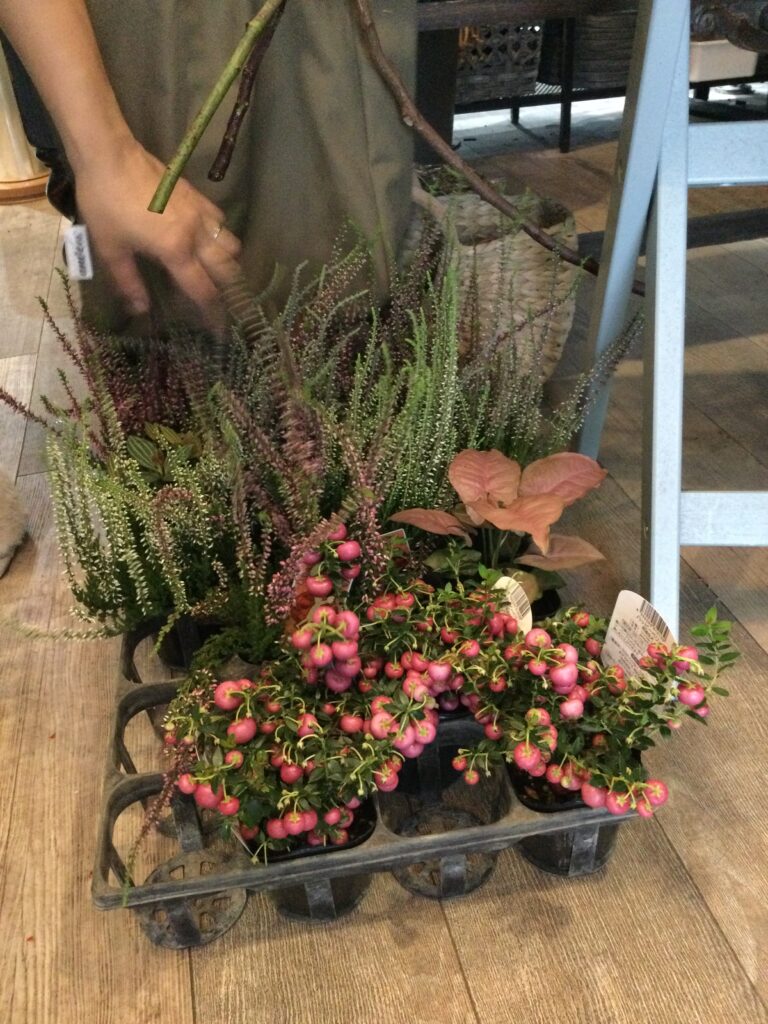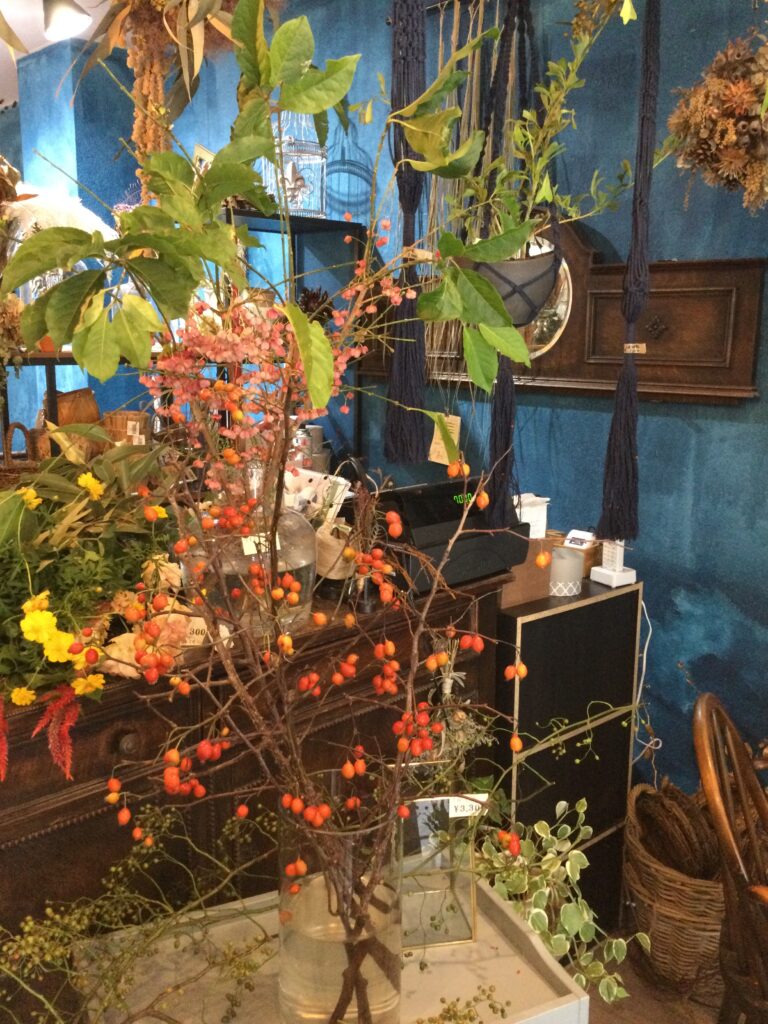 お洒落な照明に、季節の花や実はもちろん、そのほかに見たこともないような植物が。