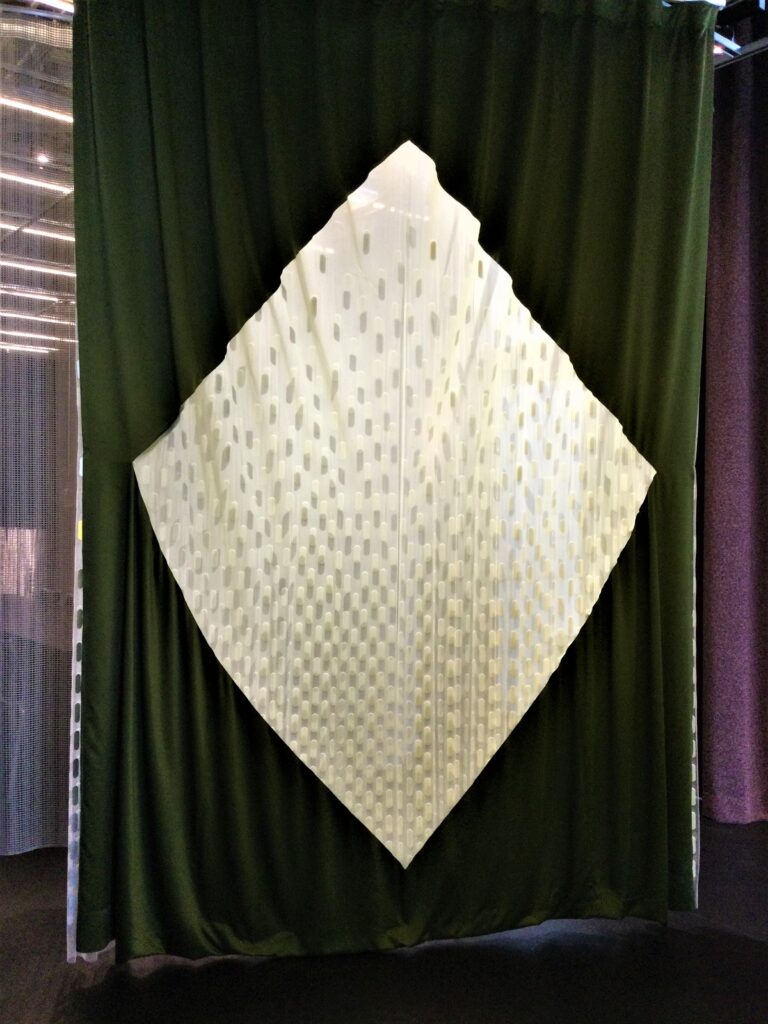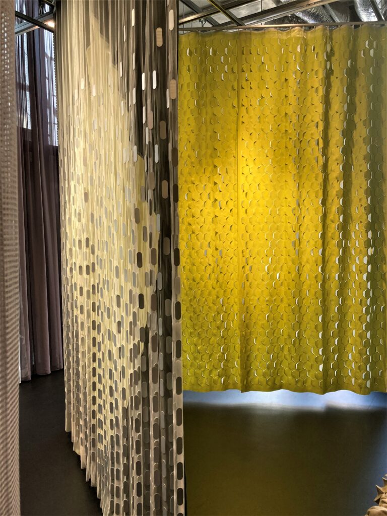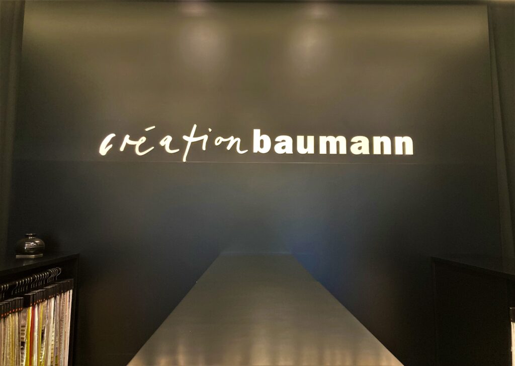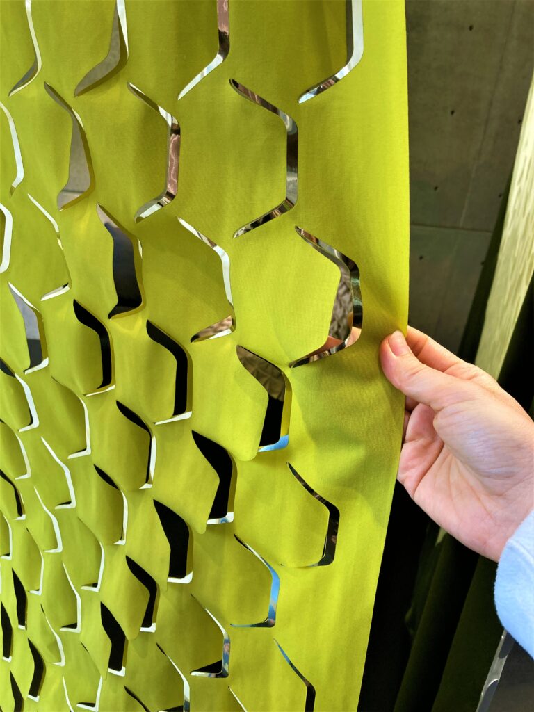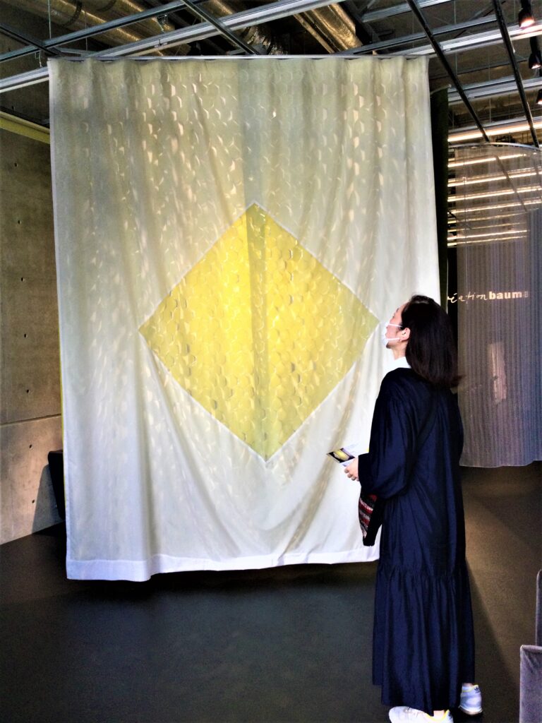 この日訪れた「クリエーション バウマン」は、スイスに本社がある創業135年の、ファブリックを生産・販売している会社です。今回、カーテンデザイナー/佐藤未季さんが、2021年発表のクリエーション バウマン新作生地を使って作品を制作、展示されていました。