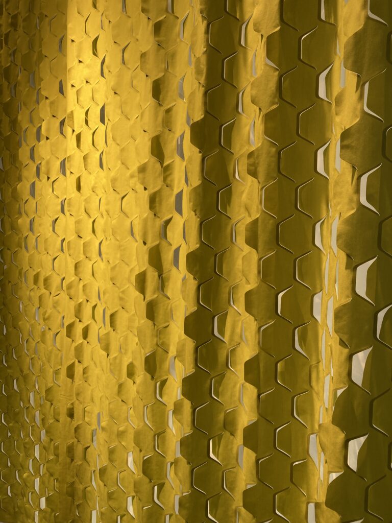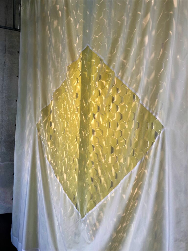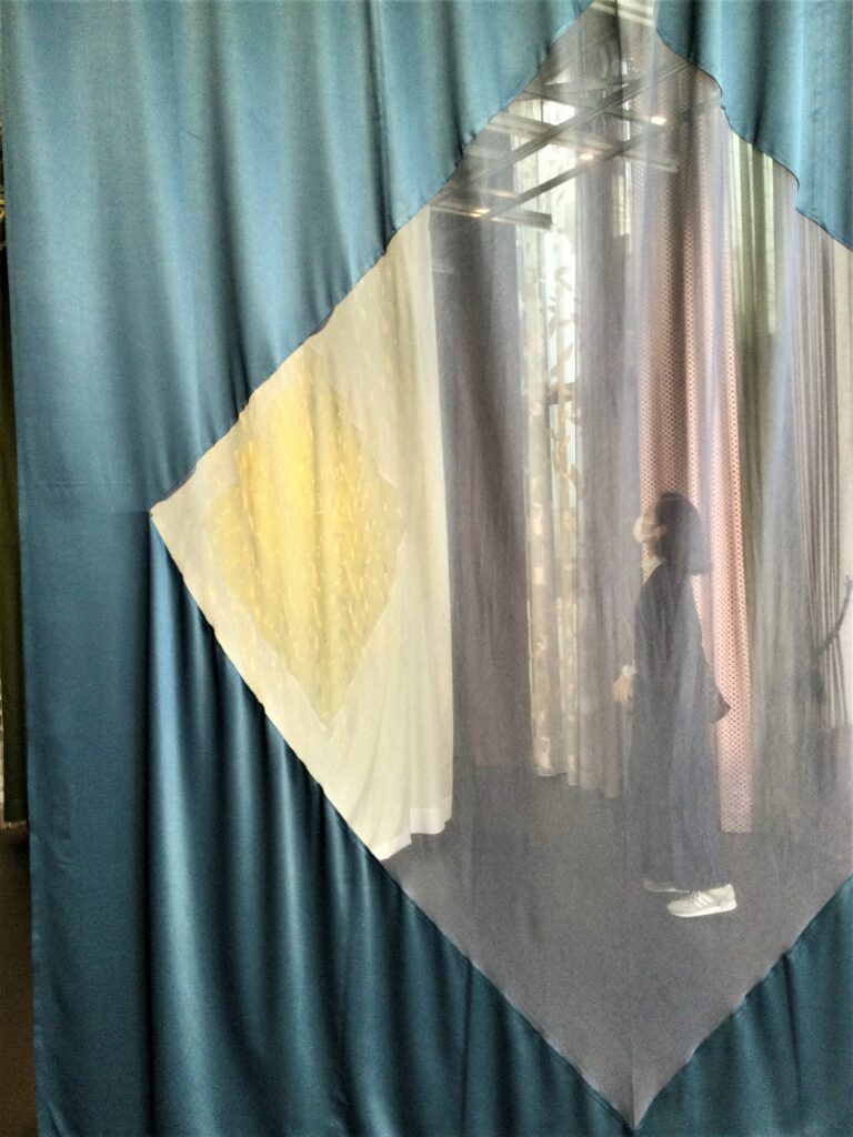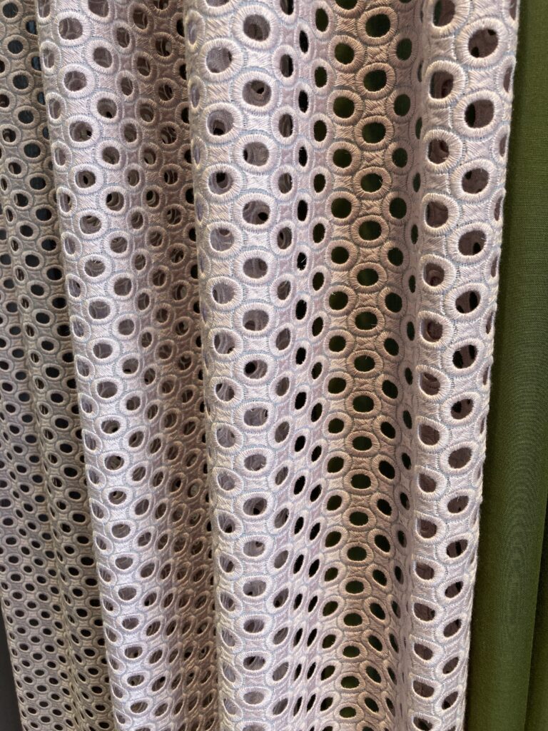 この日訪れた「クリエーション バウマン」は、スイスに本社がある創業135年の、ファブリックを生産・販売している会社です。今回、カーテンデザイナー/佐藤未季さんが、2021年発表のクリエーション バウマン新作生地を使って作品を制作、展示されていました。