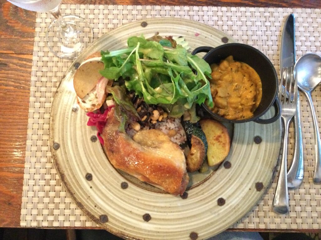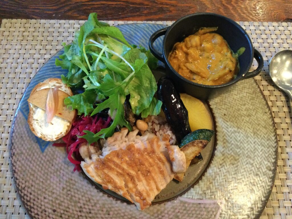 ヴィーガンメニューにプラスお肉料理を添えたプレートランチを注文。