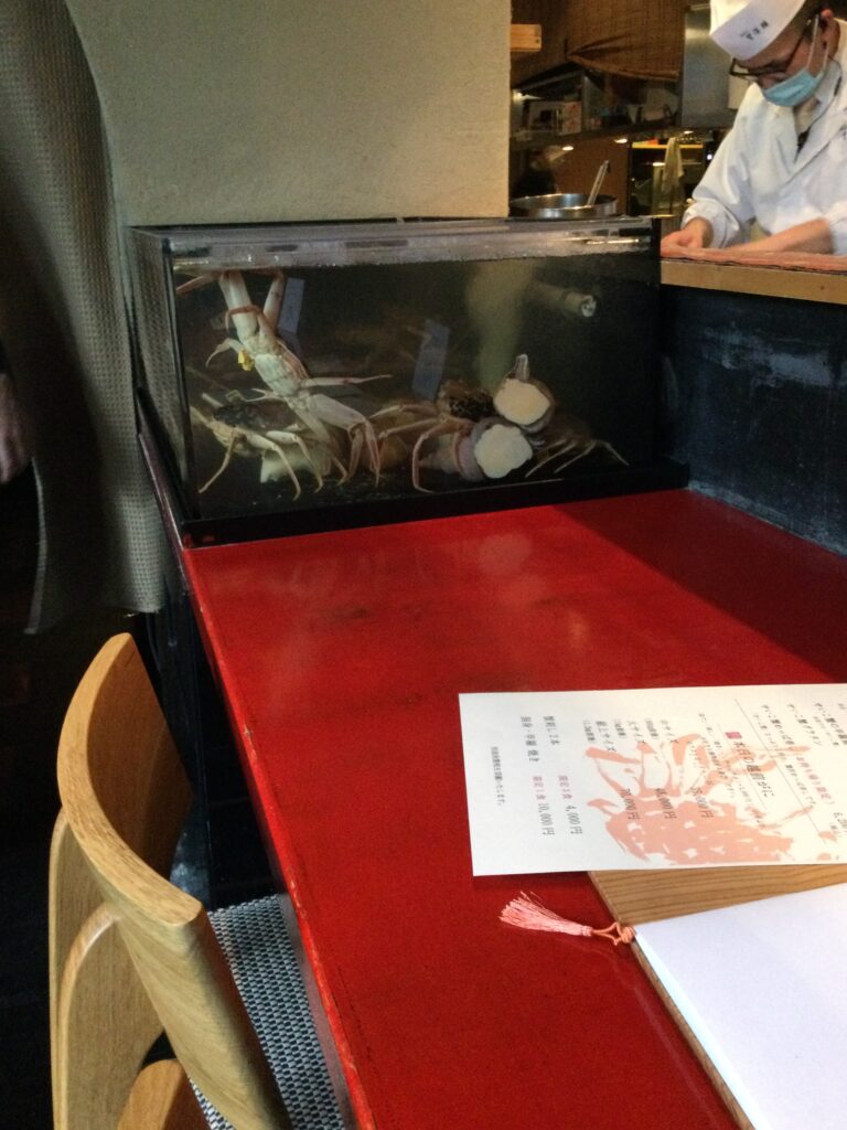 偶然にもそれぞれ訪問歴があり(だいぶ前)、良い印象しかなく、迷わず到着するという、これはきっと呼ばれていたのね。暖簾をくぐると、水槽から越前ガニの足が「おいでおいで~」。間違いなく呼んでるわ。