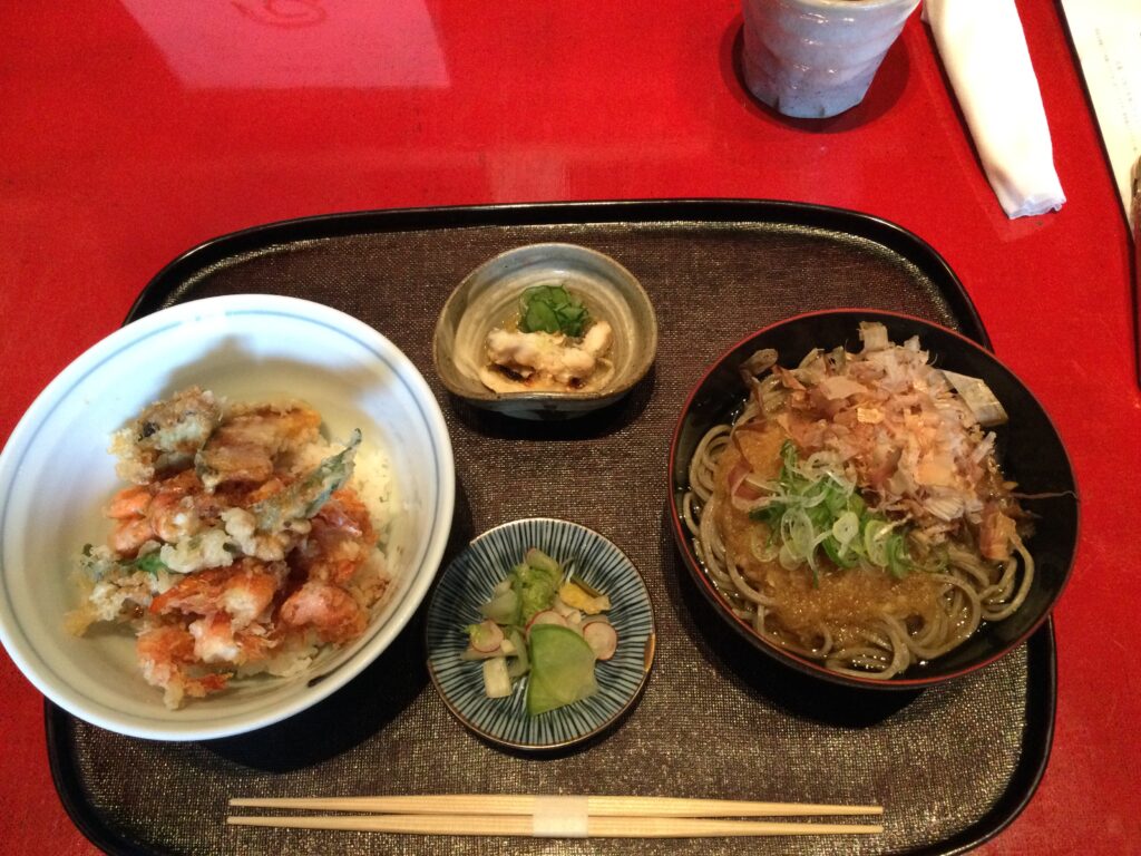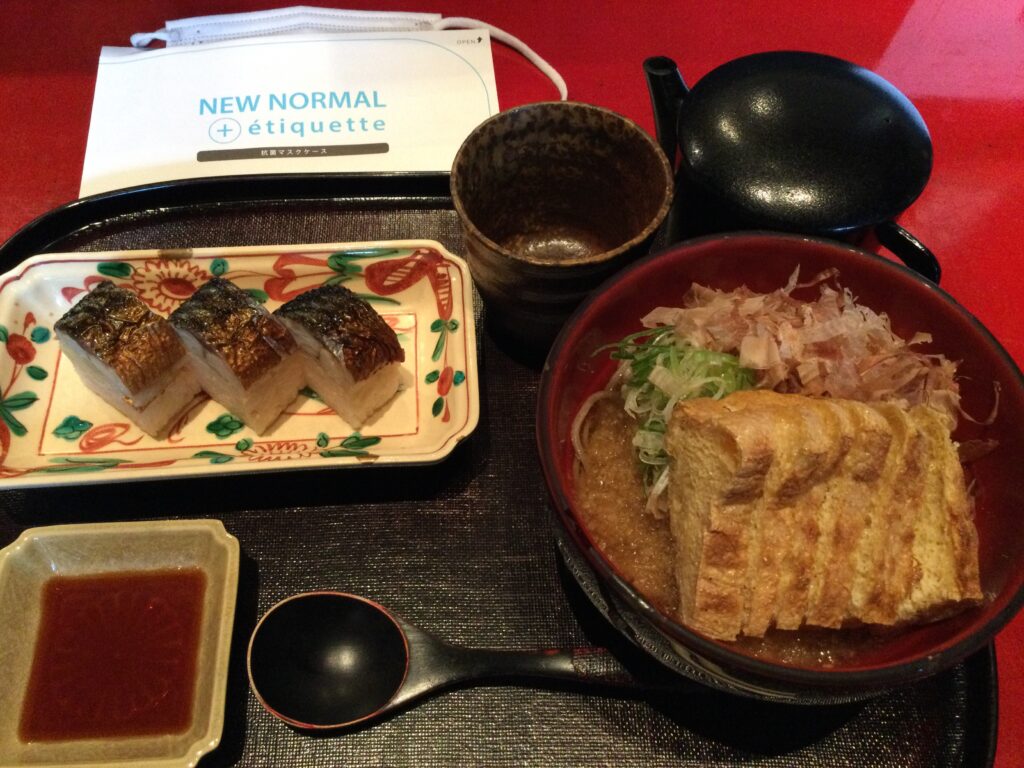 お蕎麦はそれぞれについていたので、食いしん坊の二人は(非接触を意識して)食べ始める前にかき揚げと鯖寿司をシェアします。