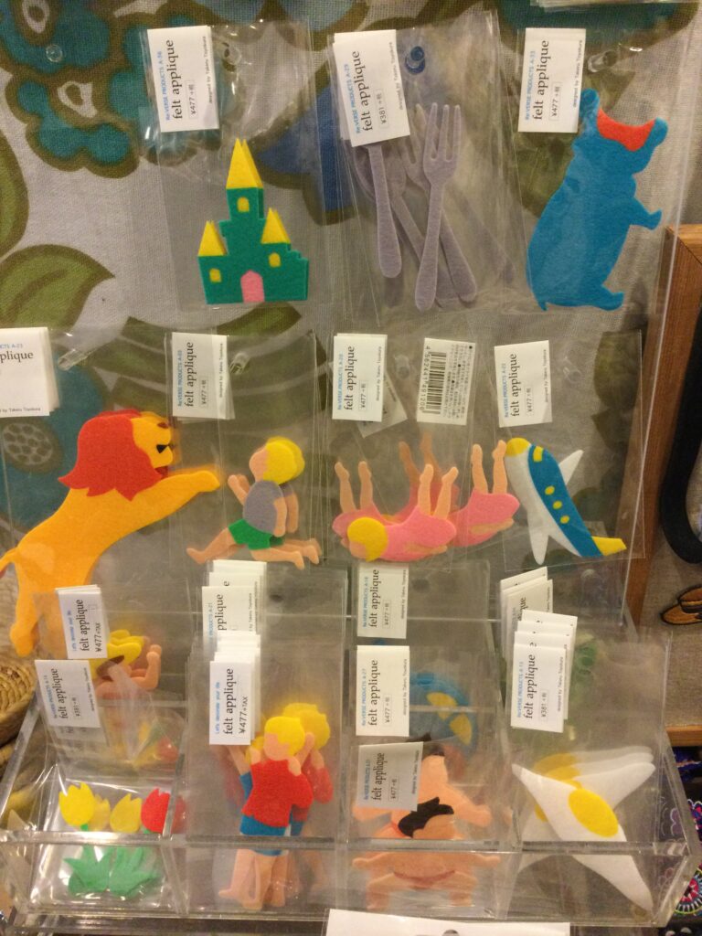 アップリケやボタン、さまざまな柄の布地、プリント柄の布テープ、などなど。