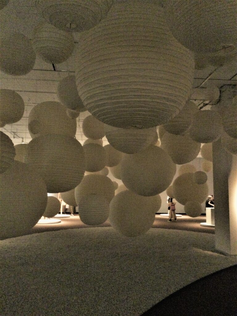 会場の中央には、150灯もの「あかり」によるインスタレーションが点灯していました。わぁっと見上げると心地よい浮遊感が!15分間のピッチで点滅を繰り返しているのですが、明かりが消えてもその存在感は消えず・・・しばらくじーっと佇んていたい気分になります。