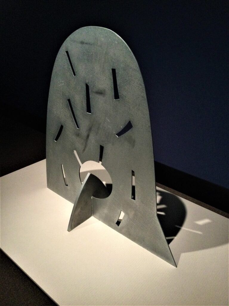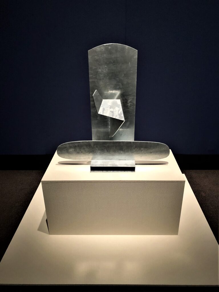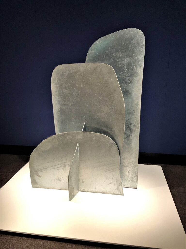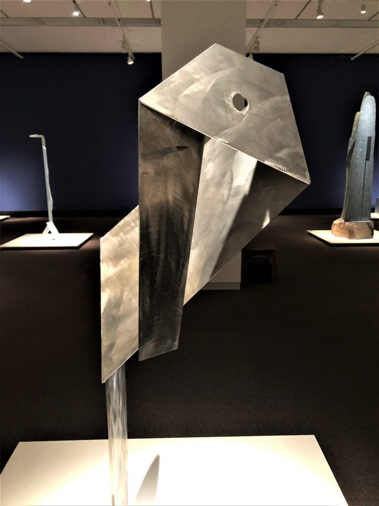 写真の作品は、切り紙や折り紙からインスピレーションを受け、平たい金属の板を折り曲げたり貼り合わせたりして作られた金属彫刻です。「軽さ」がキーワードになっています。