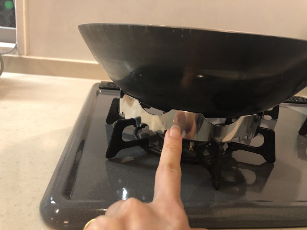 どの方向に乗せても傾いてしまいます。そこで、先ほどの輪っかを五徳の上に乗せて、その上に北京鍋を乗せると…