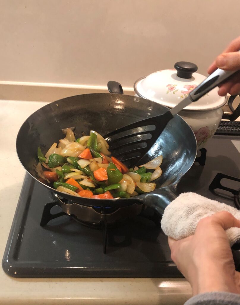 北京鍋の特長である強いカーブのおかげでとても炒めやすいので、アラヨッ!っと中華の料理人のように、自分も材料を振り上げて炒めることができそうな錯覚に陥ります。ちょっと楽しいです。