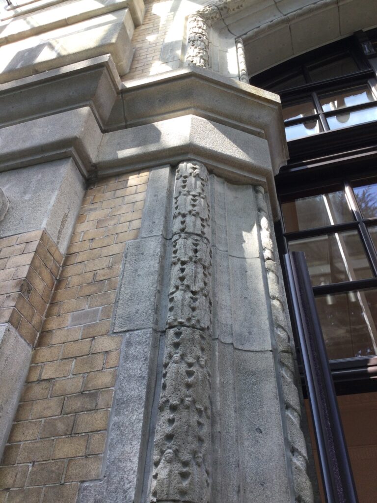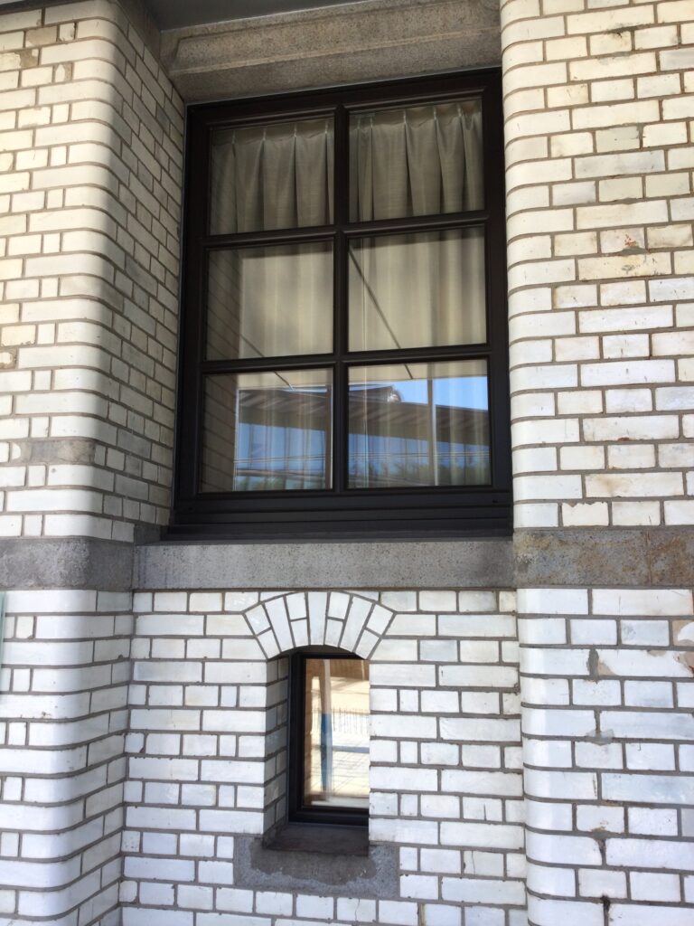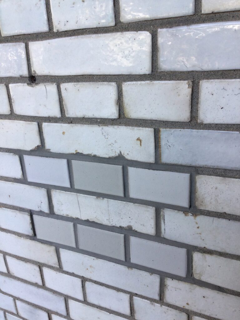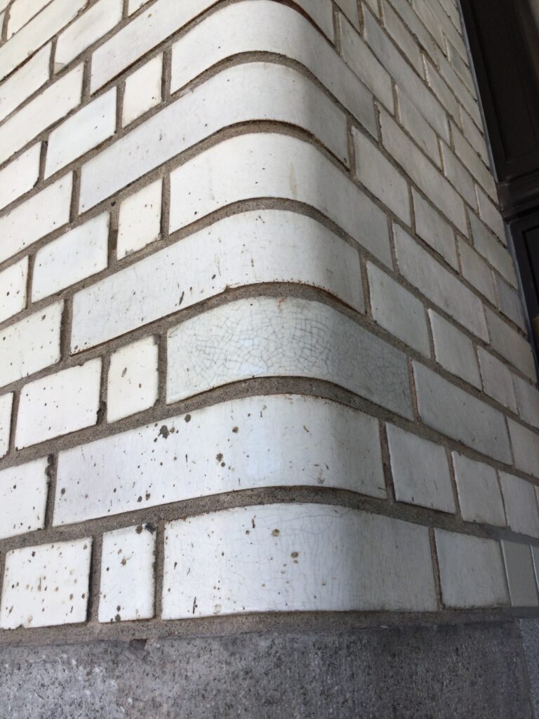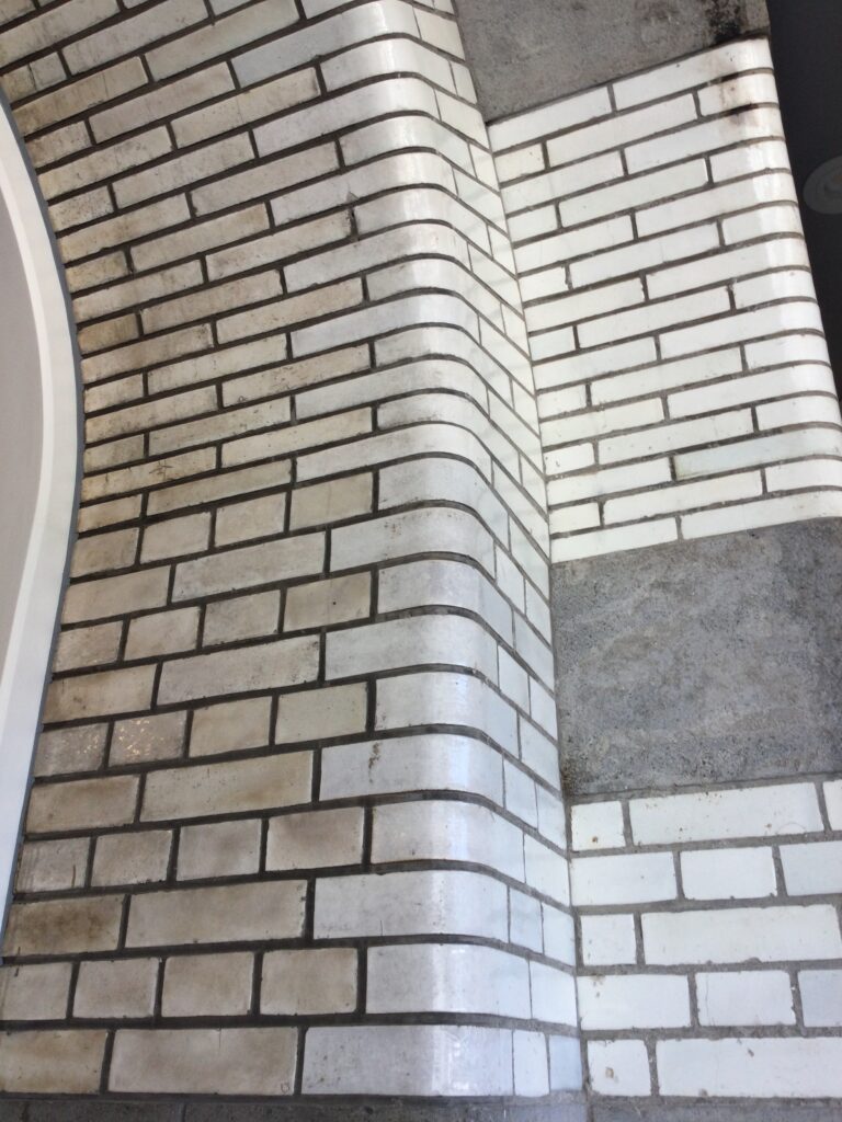 タイル好きのコジマが、特に注目したのは白い部分です(なんとタイルではなくレンガ積み)。アーチ部分の造りも目を引きますが、角の部分が凄い!通常タイルでは「役もの(やくもの)」といって、直角や面取りしてあるのですが。直角といえば直角ですけど、ゆるいカーブなのです。もしかすると、レンガだから可能なのかも…?