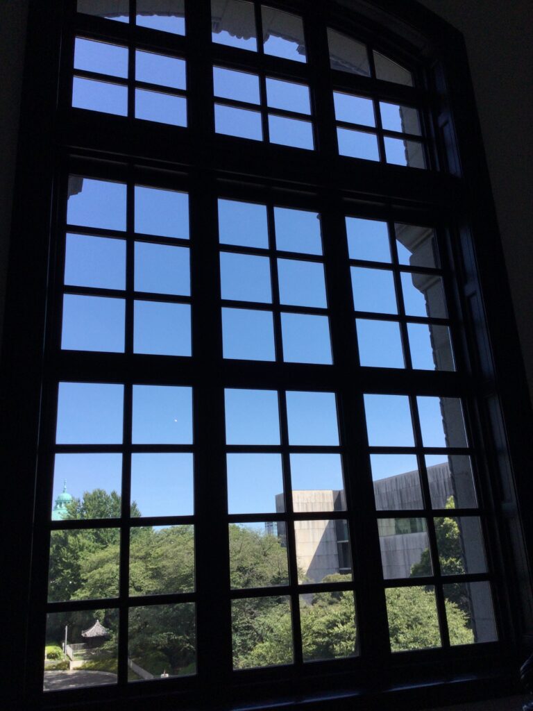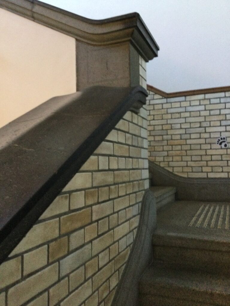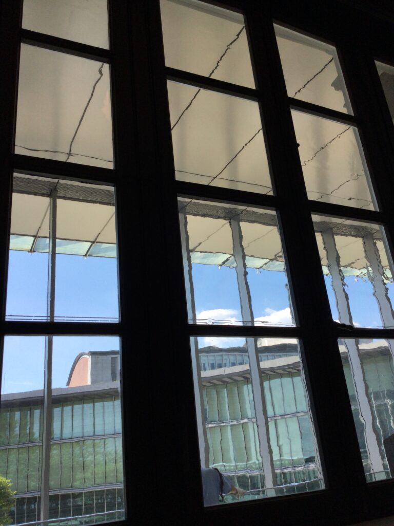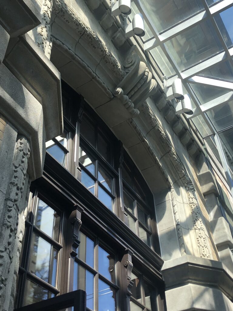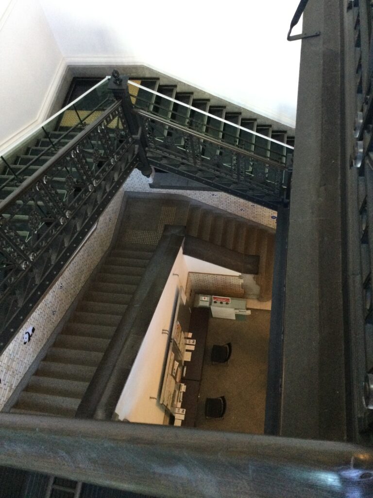 例えばこの階段(手すりの意匠まで凝っている)を登っていくと大きな窓、上野の杜も良く映えて素敵です。そして3階に上がると天井の高いホールがあり(まるで教会のよう)、テラスの外から外壁を見ることもできます。もしご興味をお持ちなら、「子ども」「図書館」という名前を気にせず入館すれば、図書館利用しなくても建物の外観だけでなく内装をじっくりと見る価値、かなりあるのではないでしょうか。