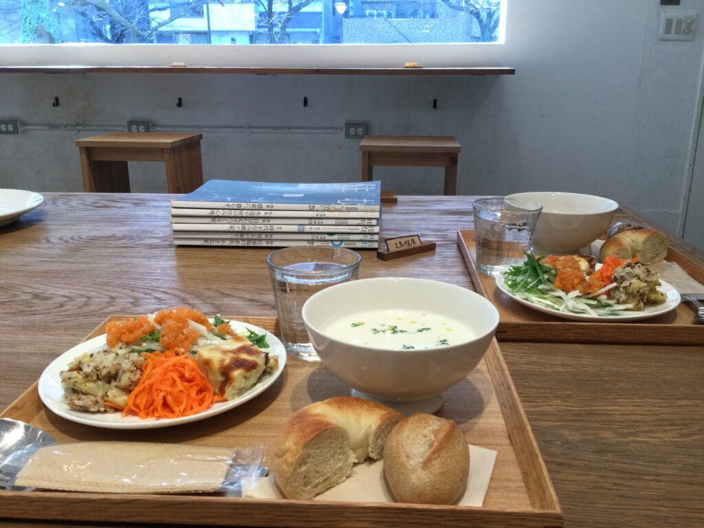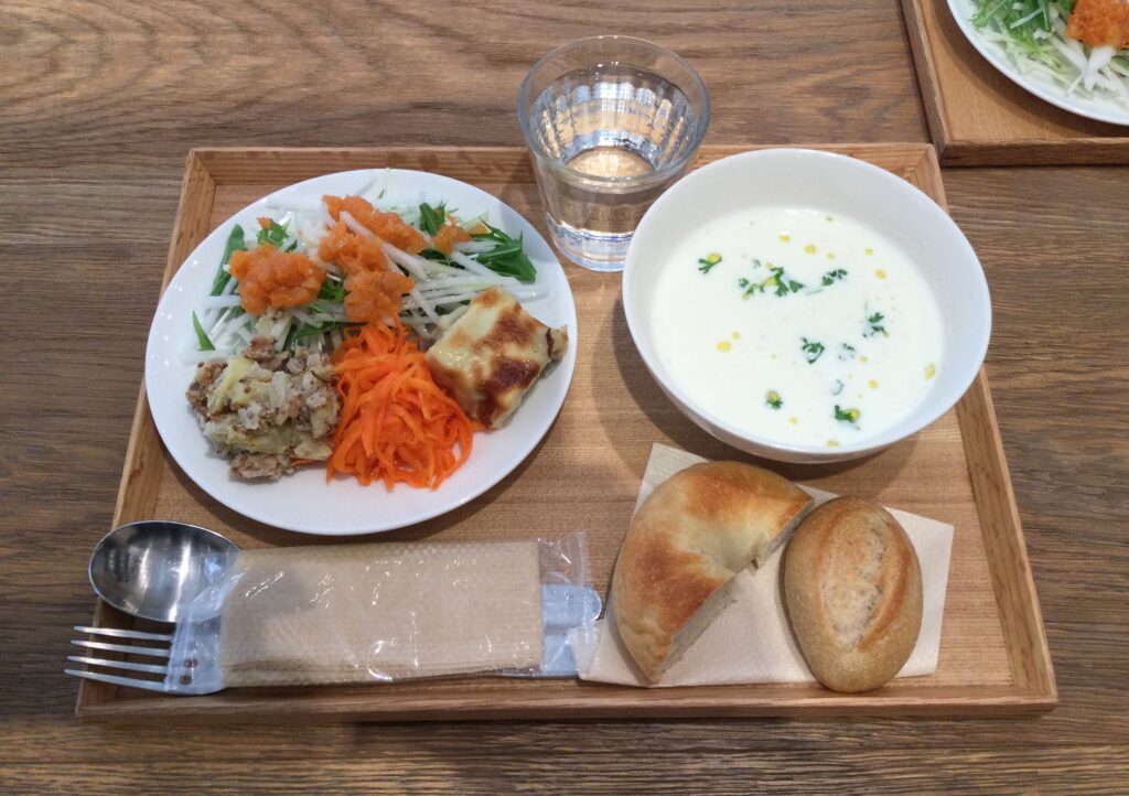 ケイコは「ごぼうのクリームポタージュ&無農薬玄米のおにぎり(他コジマと同じ)」のセット