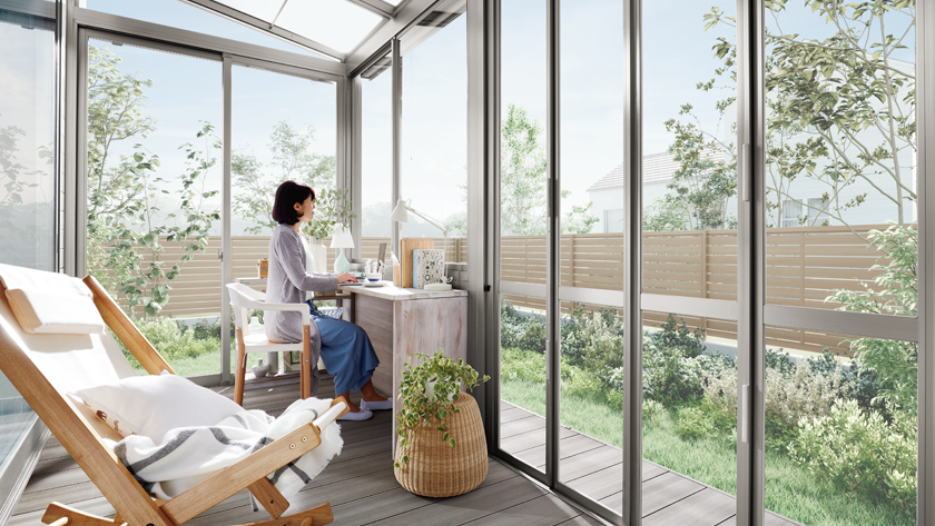 在宅ワークに完全シフトするという方は、LIXILの「ガーデンルームGF」で開放感あふれるワークルームを新設するというプランもおすすめ。観葉植物などを配置して、お気に入りのリラックス空間を作ってみてはいかがでしょう。休日にバーベキューを楽しんだり、花粉の季節や雨の日の洗濯物干し場として利用したり、ワークスペース以外にも活用できます。