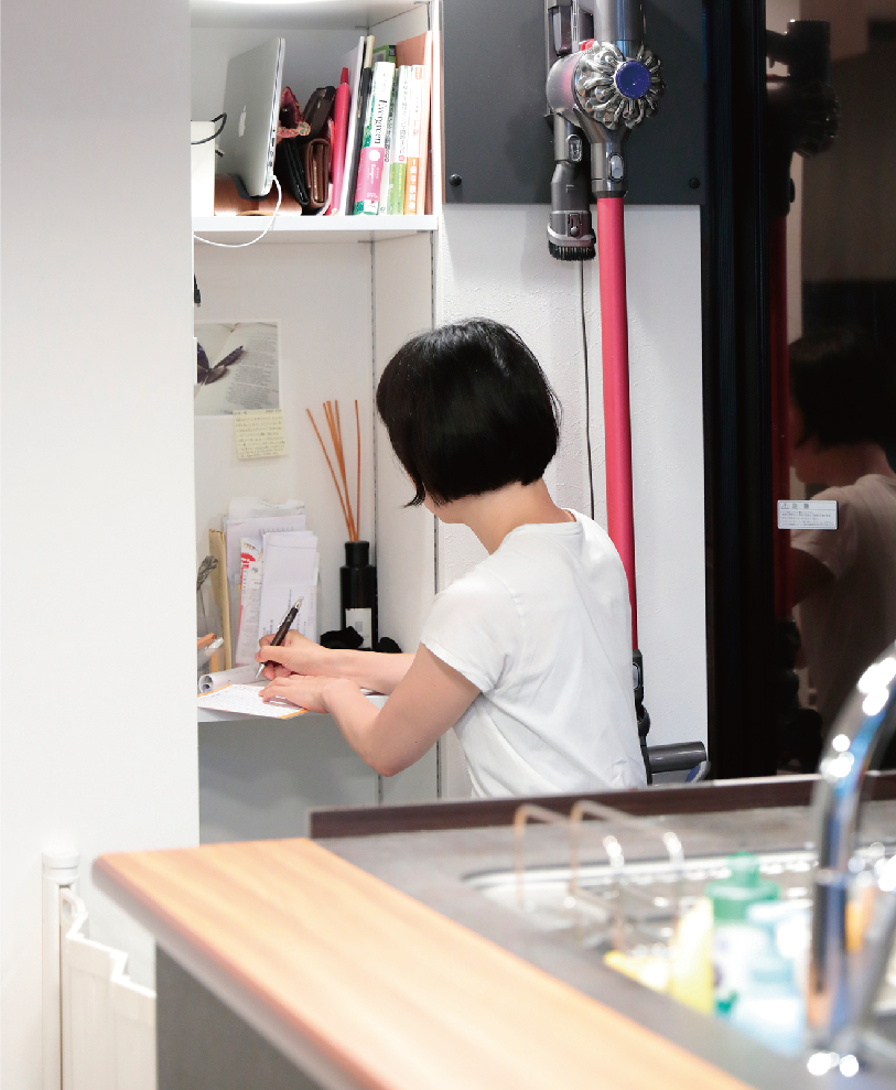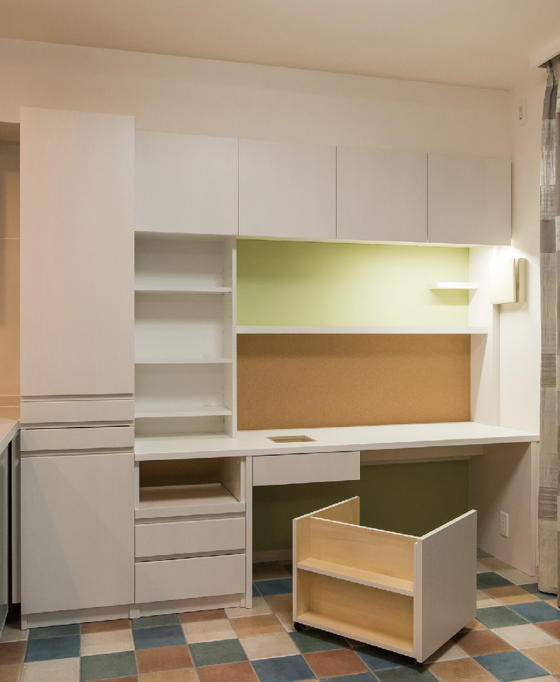 奥様のためのワークスペース。キッチン横に作ることで、家事と仕事の両立をサポート。基本は、パソコンで料理のレシピを見たり、保育園の連絡帳を書いたり、持ち帰りの仕事をこなしたりといった、ちょっとしたワークをするための場所ですが、在宅ワークのスペースとしても活用できます。