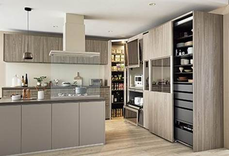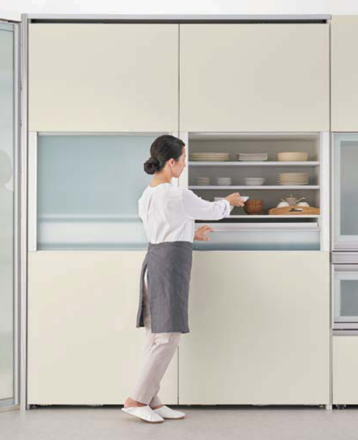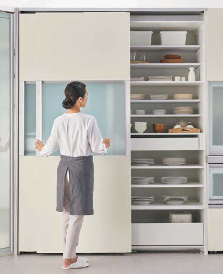 大型扉の中段エリアに昇降式の“窓”が設けてあり扉全体を開け閉めしなくても、必要な物をサッと出し入れできます。