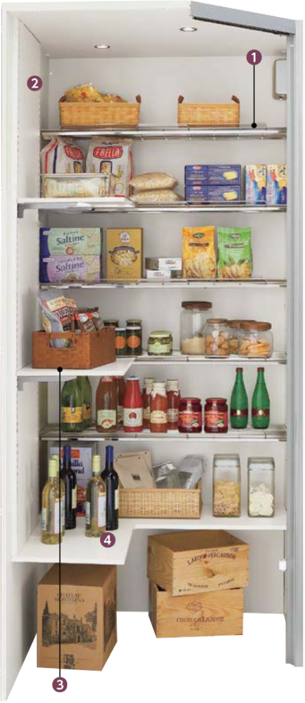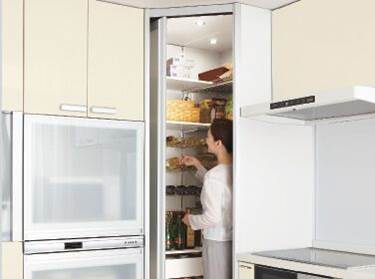 コーナーを生かしたウォークインタイプのストックルーム(コーナークローゼット)。買い置き食品のストックはもちろん、調味料や非常用の食品や飲料水などを様々なモノを収納できます。ウォークインタイプなので出し入れしやすく、お掃除もラクですますよ!