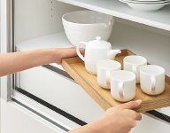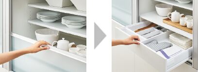 取り出した食器の仮置きやお盆にのせるスペースもあります。棚板を浅くして、作業のしやすさにも配慮しました。