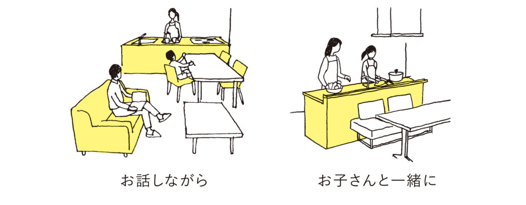 対面キッチンのよいところは、幼い子どもを見守りながら料理ができるところ。子どもたちが少し大きくなってくれば、子どもとお話しながら料理ができ、子どもが料理に関心を持つきっかけにもなります。小学生にもなれば、お子さんと一緒にお菓子作りやお料理を楽しめますよ(笑)