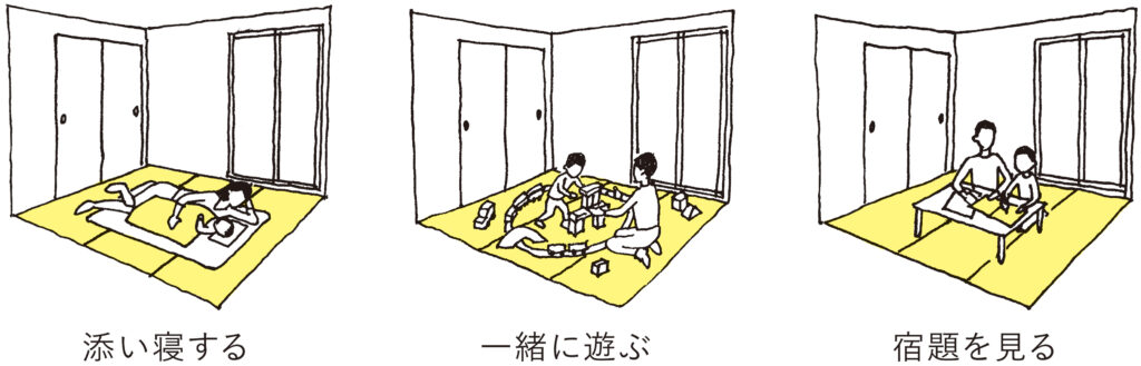 子どもが幼児の間はお昼寝や遊び場に。児童になったら宿題をするなど学びの場に。子どもたちは遊びながら、学びながら、いつでもママやパパを身近に感じることができます。来客時の寝室にも。