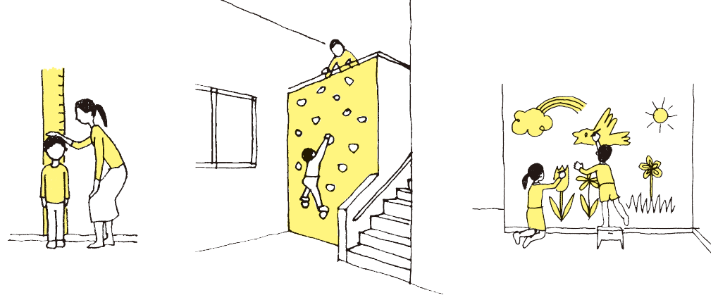 子どもの背丈を記録する柱。すくすく育つ我が子の成長を実感できます!柱への記録をお誕生日の定番行事にしてもいいかもです。きっといい思い出になるのではないでしょうか。いつの日か子どもが巣立っても家の中に子どもがこの家で暮らして成長した証が残ります。子どもが結婚し親になったとき、孫の背丈と我が子が幼かった頃の背丈をくらべてみる、という楽しみもあります。