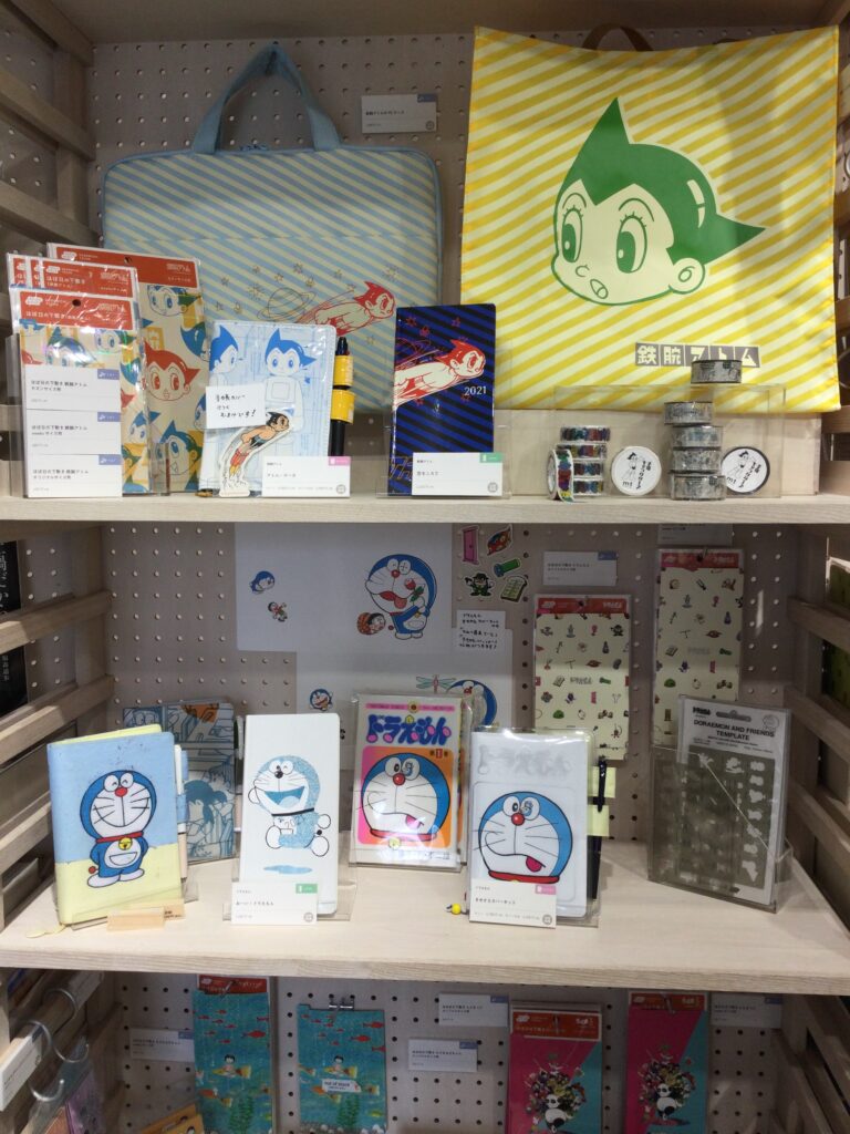 目につくのはドラえもん、アトムにまる子…小さい店内にギュギュっと昭和世代の心くすぐるグッズがひしめき合っています。
