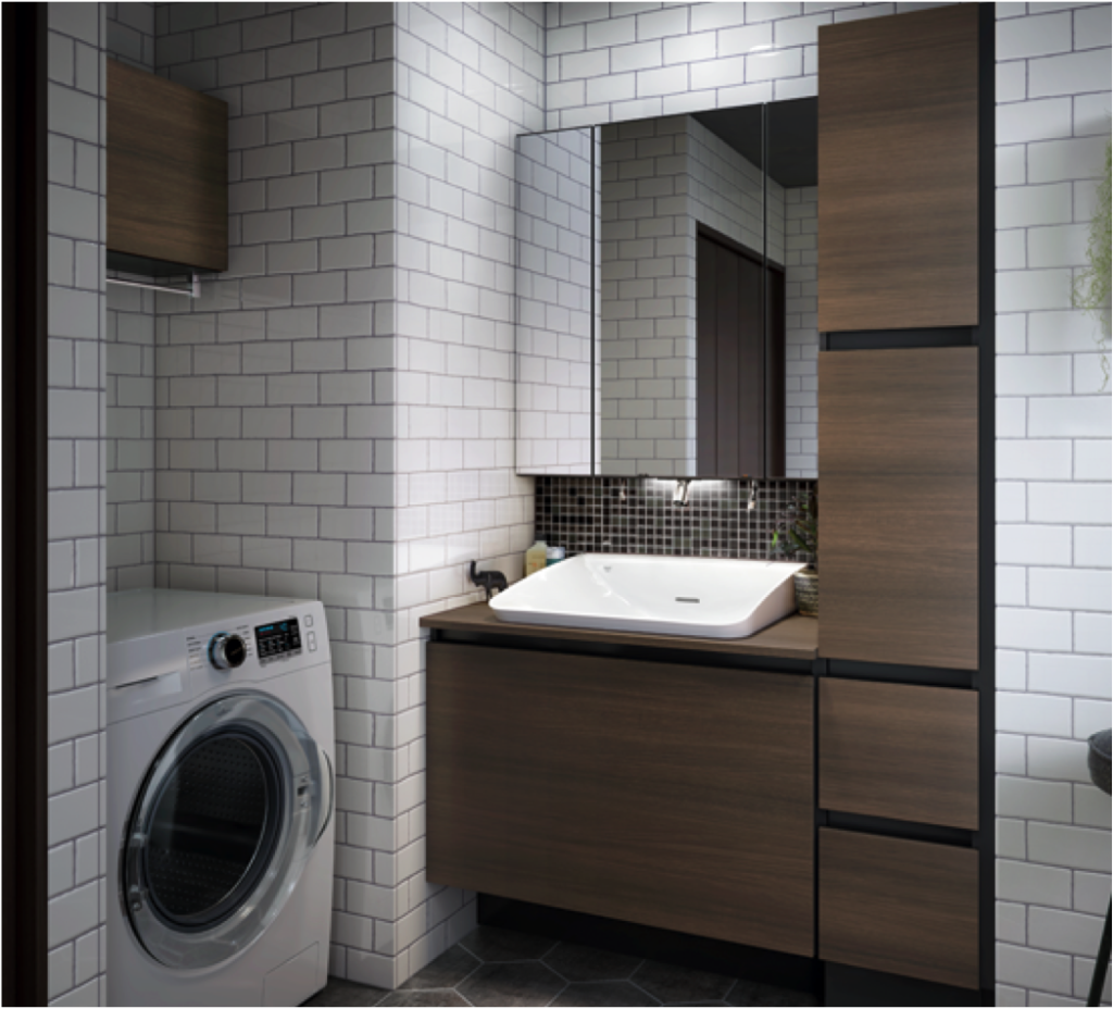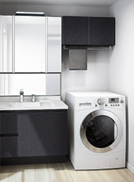 洗面化粧台は、鏡の背面に収納できるタイプが、すっきり片付いて便利です。 洗濯機がドラム式だったり、乾燥機を使わない場合は、洗濯機の上部にランドリーキャビネットをつけると、スペースが有効活用でき便利です。スペースに余裕があれば、家族の下着を収納できると便利ですね。