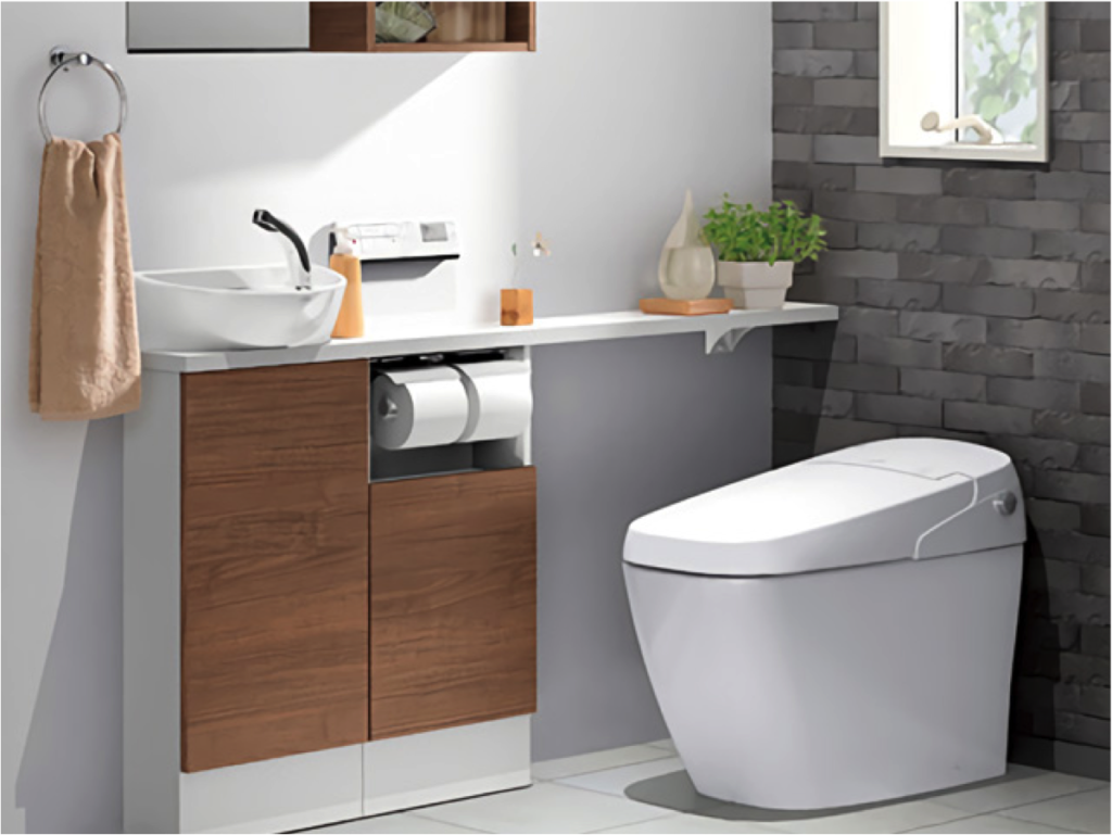 トイレットペーパーや、お掃除ブラシなどは、側面の収納場所が取り出しやすく便利ですが、買い置きのトイレットペーパーや、紙おむつの収納には、トイレ上部にキャビネットを取り付ける事をおすすめします。 袋の上部をハサミで切って、取り出しやすくしてから、袋のまま収納しましょう。