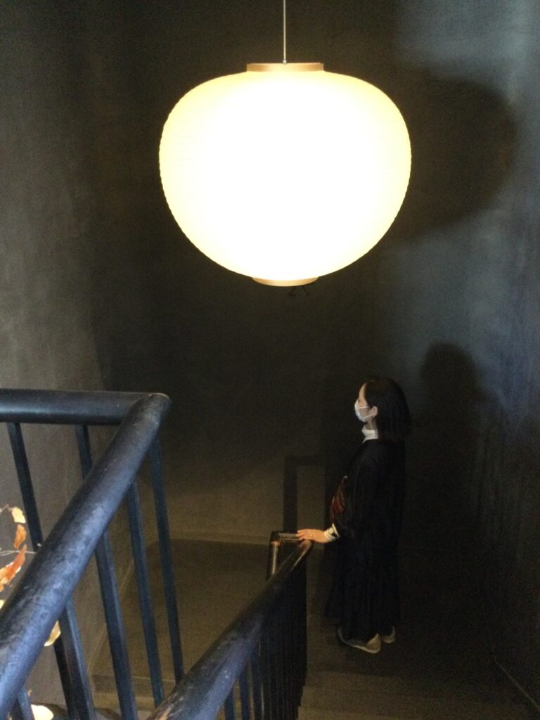 ガラス越しに見える薄暗い空間に、巨大な和紙張りの照明器具と、柿の実が見えます。かなり和を感じる雰囲気ですね。