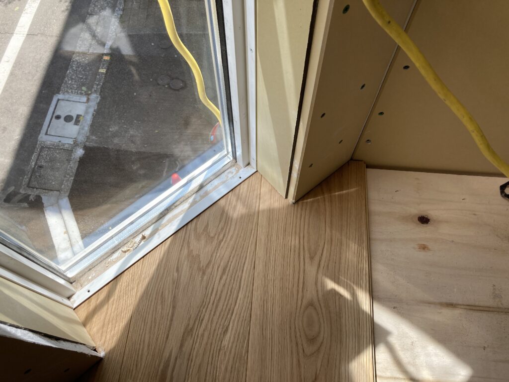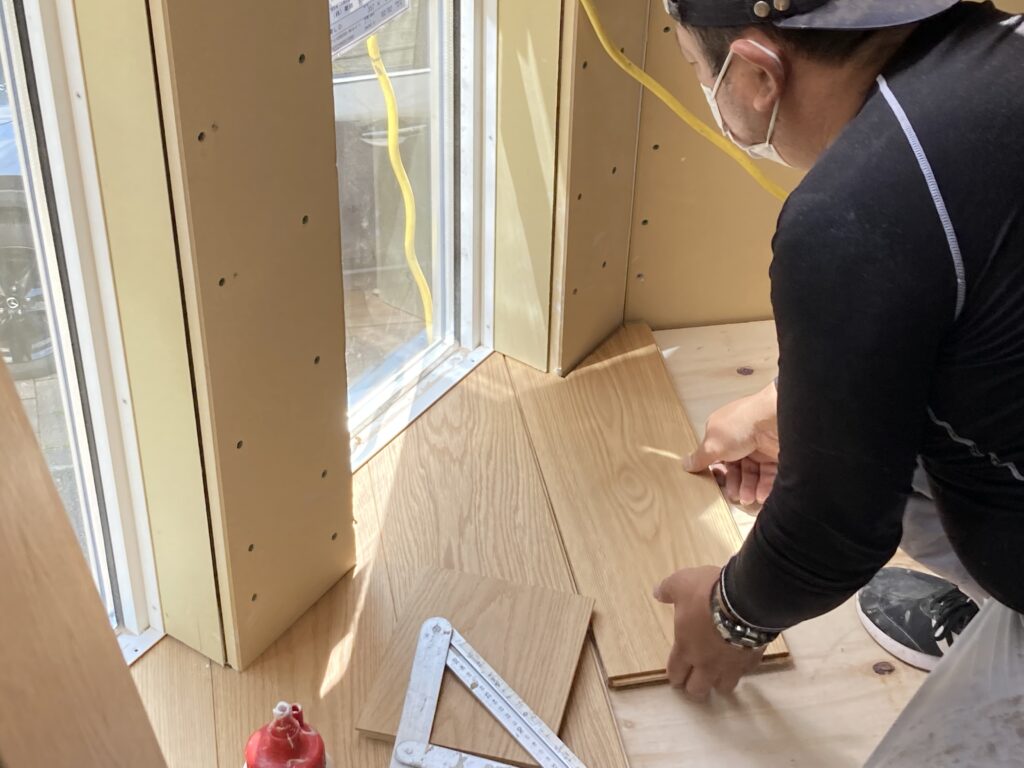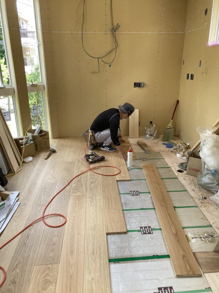 2Fリビングでは、フローリング貼り付け工事が行われていました