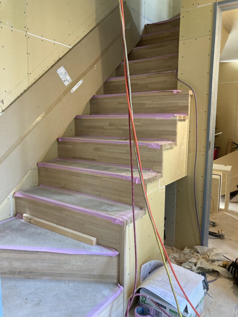 新宿区 M様邸/新築/施工工程 ⑳フローリング・石膏ボード取付(天井部分)・階段(木製)