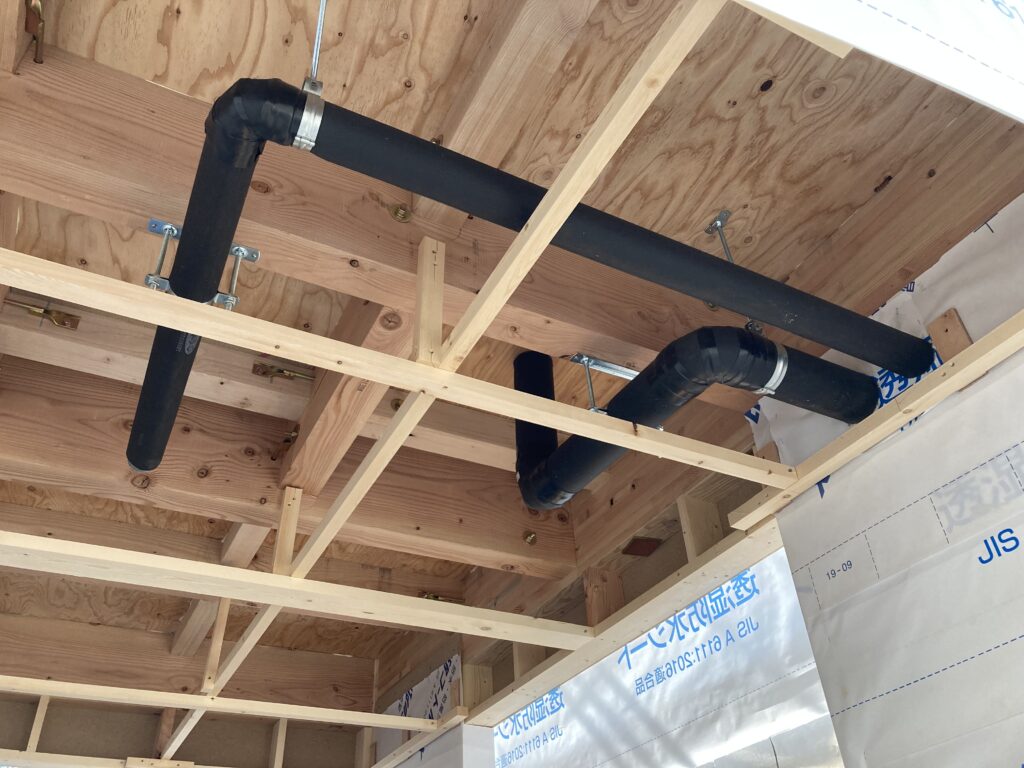 2Fの排水管には遮音材を巻きます(黒いシートのもの)