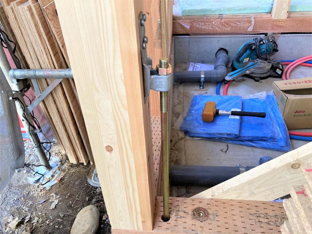 “ホールダウン金物”は、柱が基礎から抜けないように、建物の中でも特に力がかかる柱に使われます。離れていたり、斜めに設置すると強度に問題が出てくるので、正しい位置に真っ直ぐに取り付けることが必須です。