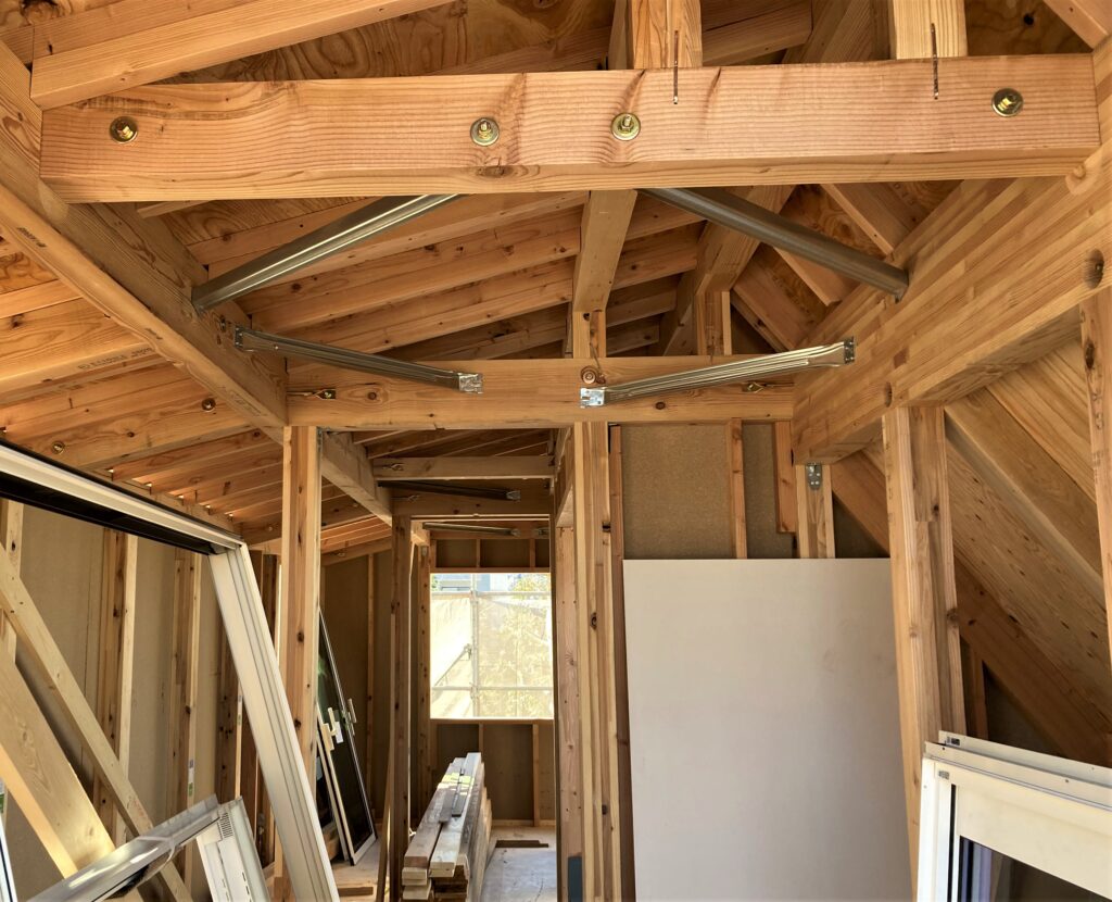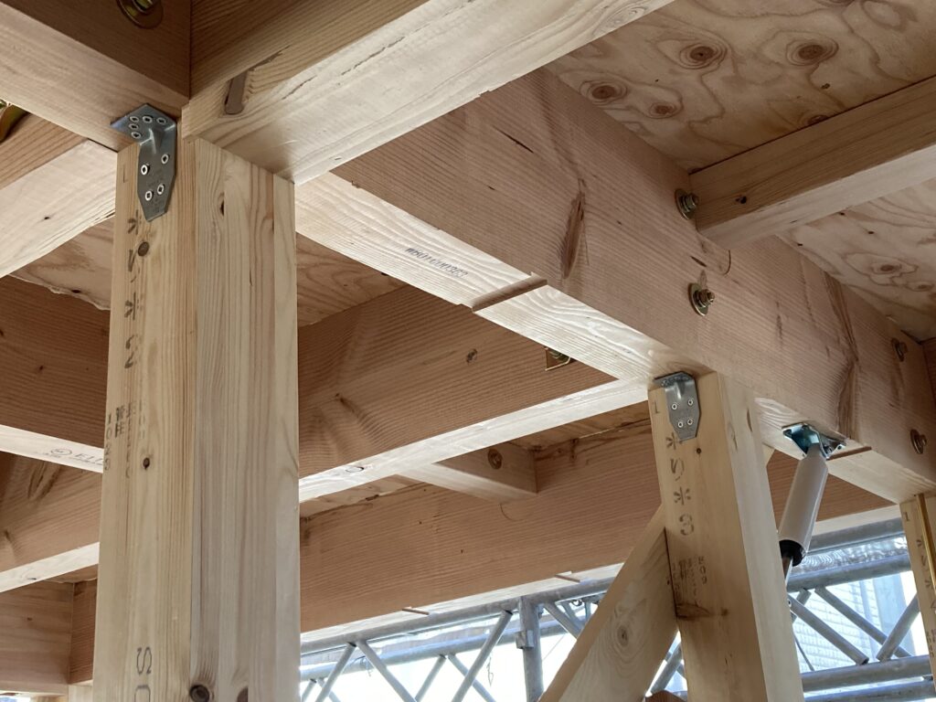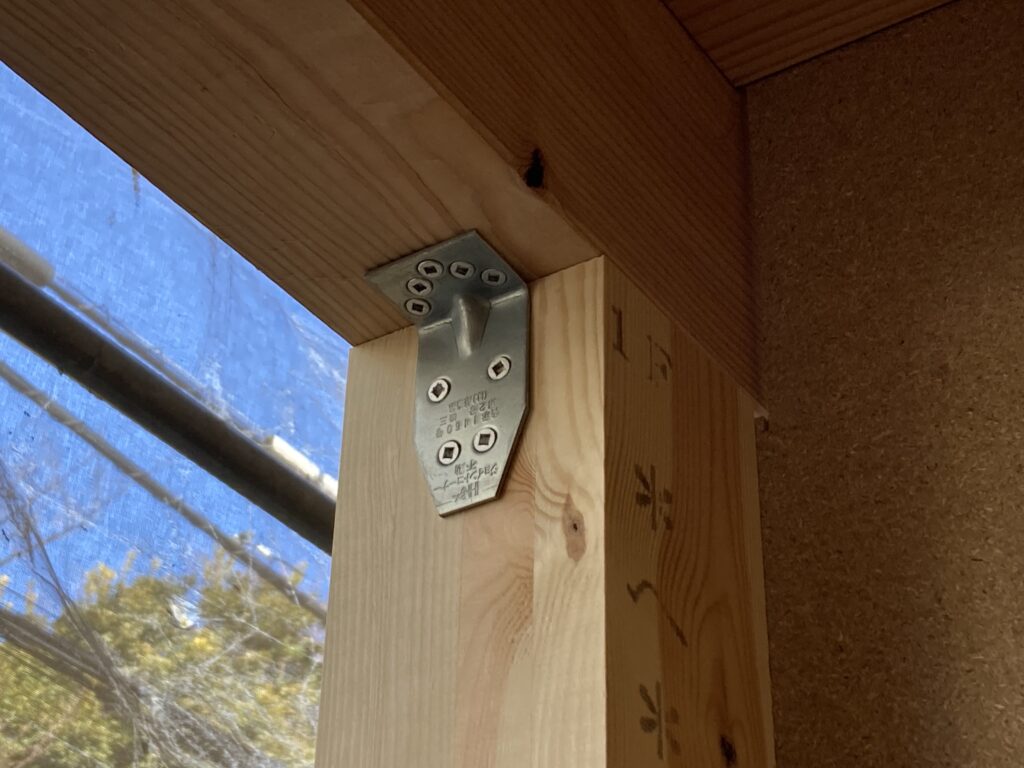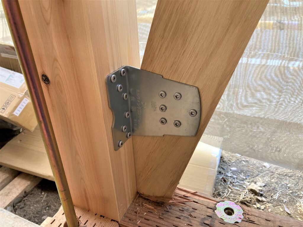 いざ組まれている躯体の細部を見てみると、いろいろな種類の金物が使われていることに気付きます。