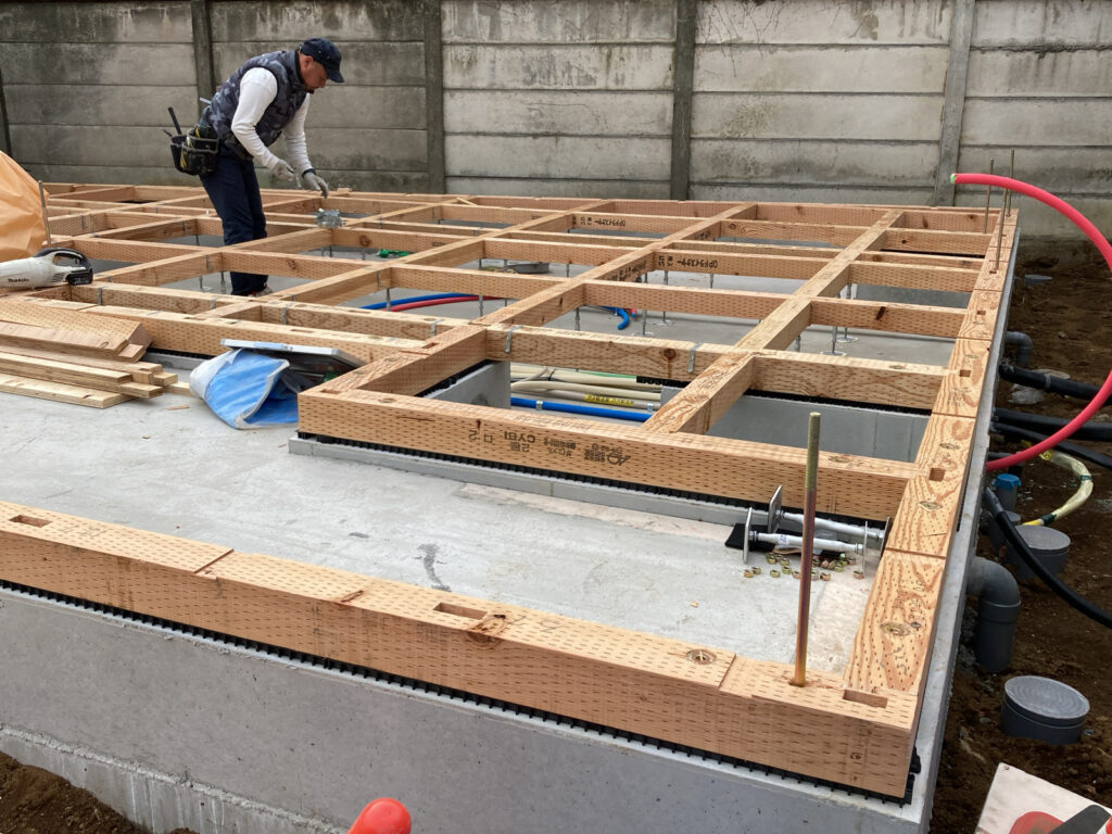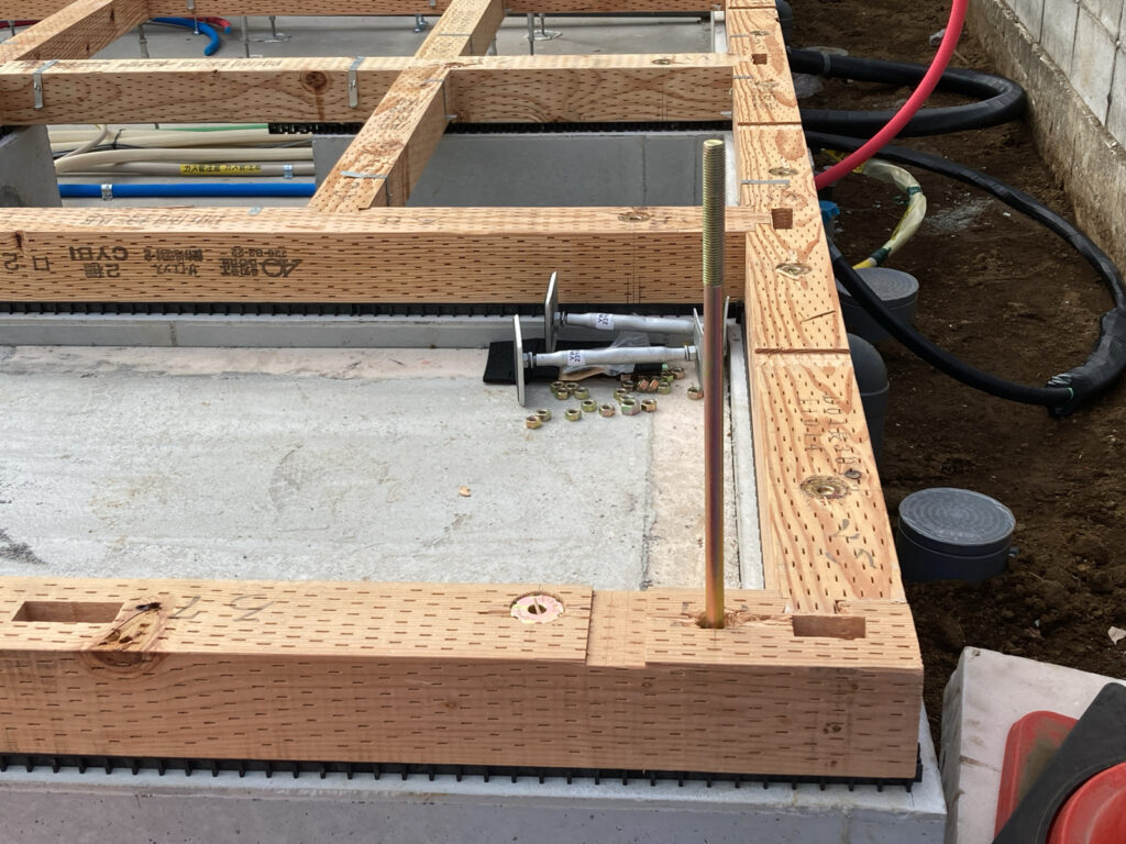 コンクリート基礎の上に、プレカット工場で正確に加工された横材(横に使われた木のこと)が置かれています。ここで使われる横材の事を「土台」といいます。