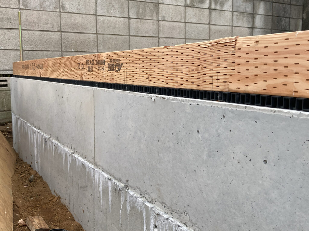 よく見ると、コンクリート基礎と木の土台の間には、黒い「基礎パッキン」という部材が挟まれています。