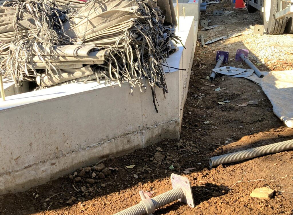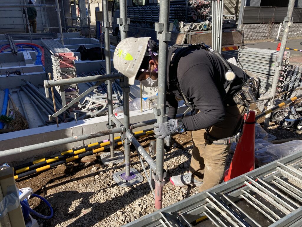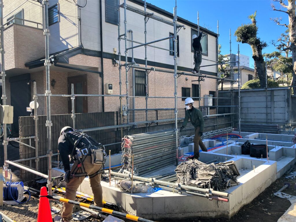基礎工事が終わり、「建て方(たてかた・建物を建て始める作業のこと)」が始まる前に、先に「足場」を作っておきます。これを“足場先行工法”と言います(先行足場)。