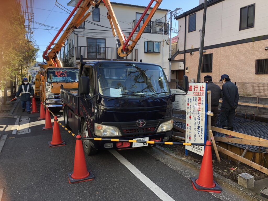 生コンクリートを流し込むポンプ圧送車が到着し、作業開始です!