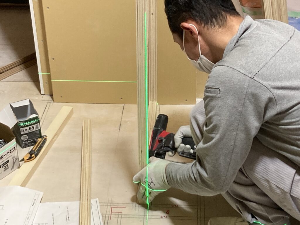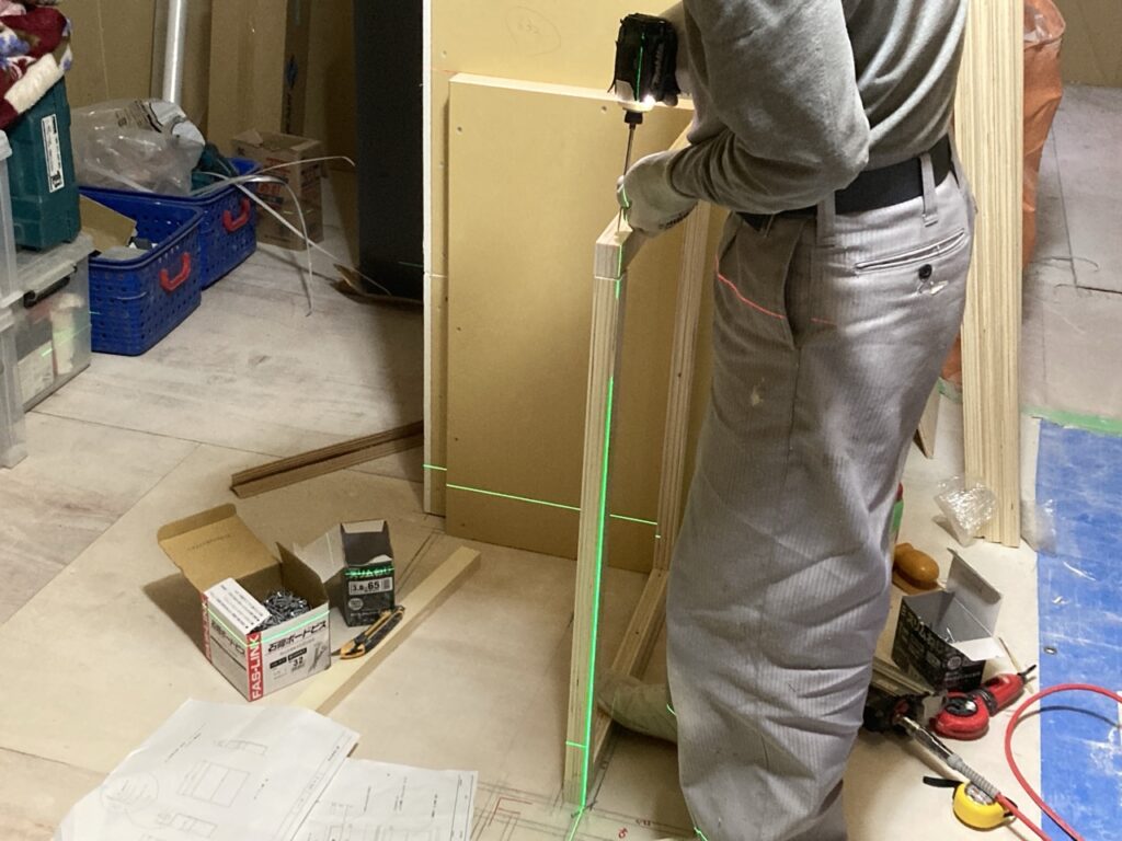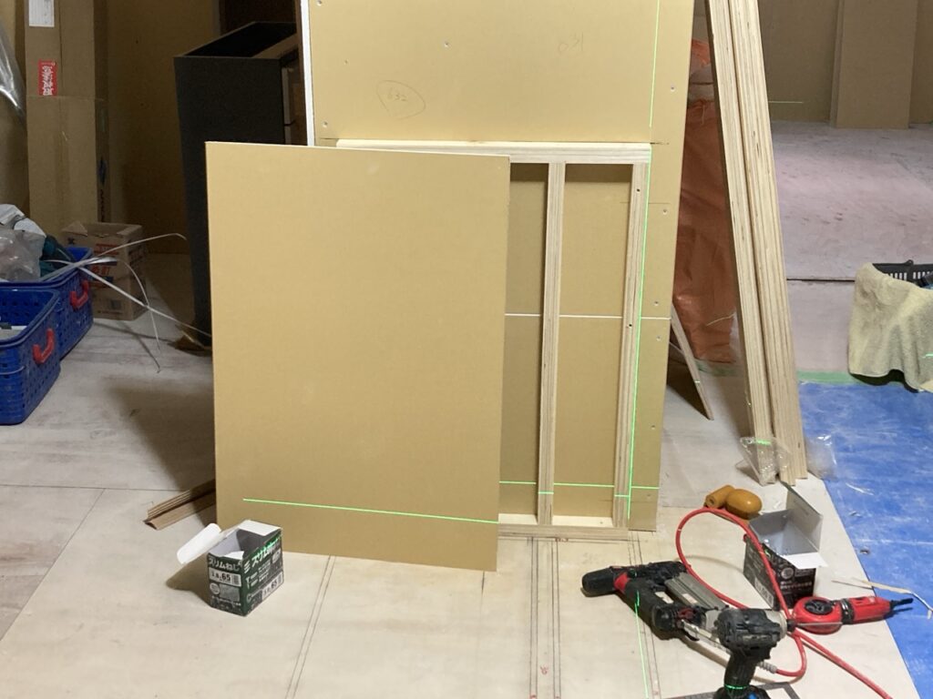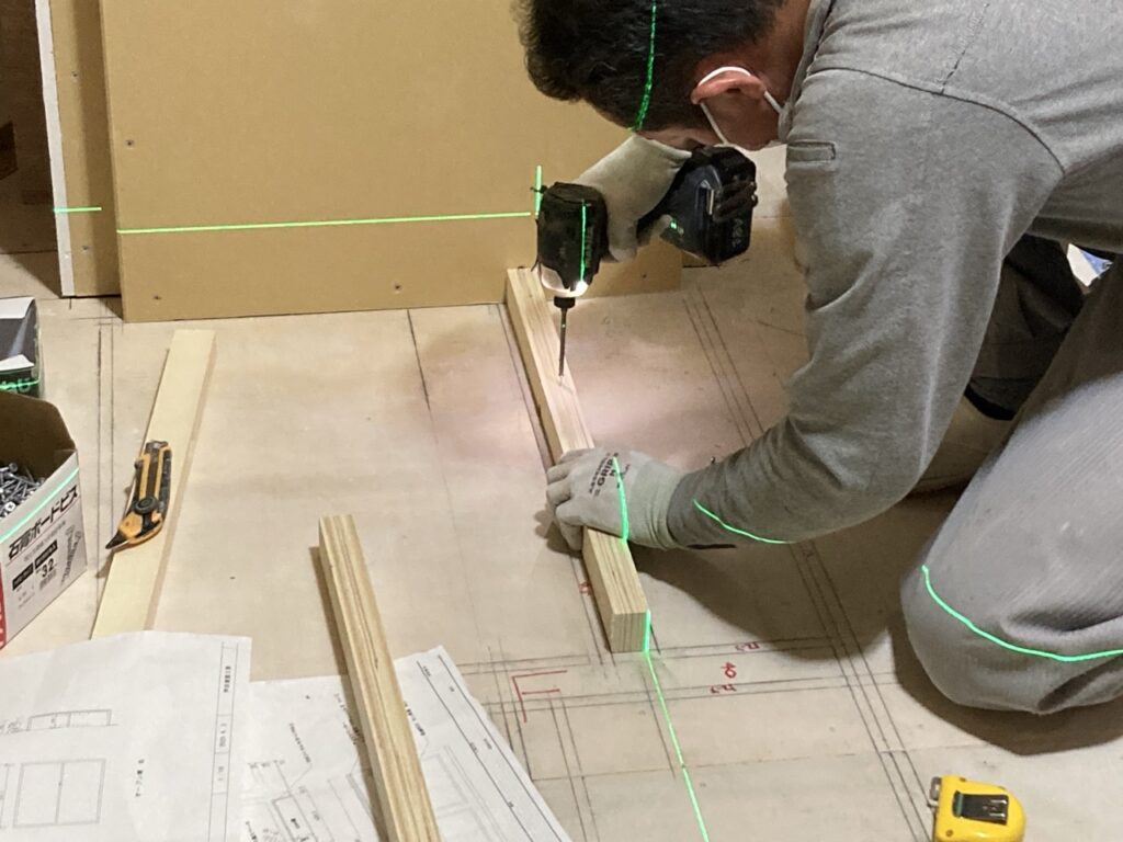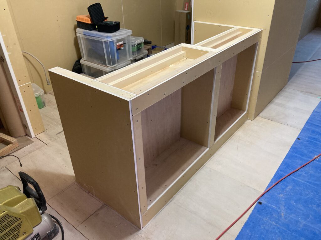 壁付けのキッチンが取り付けられるのですが、その背面側に設置されるカウンターを作っていきます。