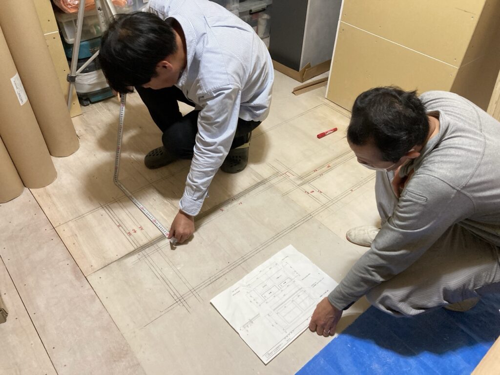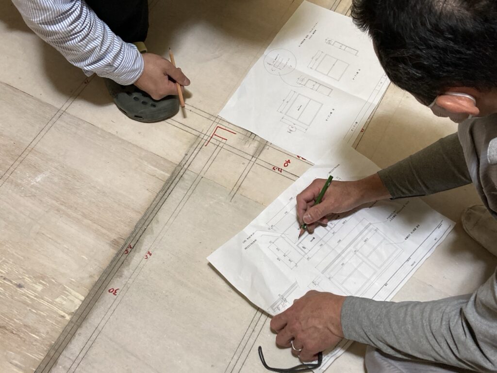 C様邸担当の弊社福永(左側)と大工さん(右側)が図面を見ながら確認作業をしています