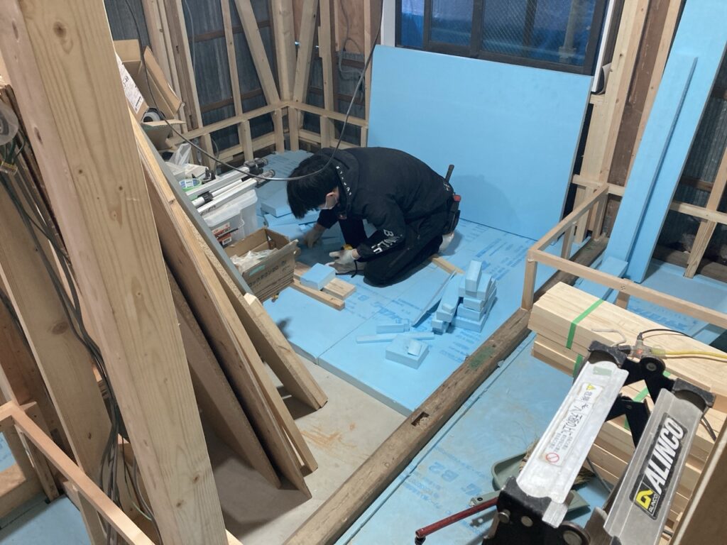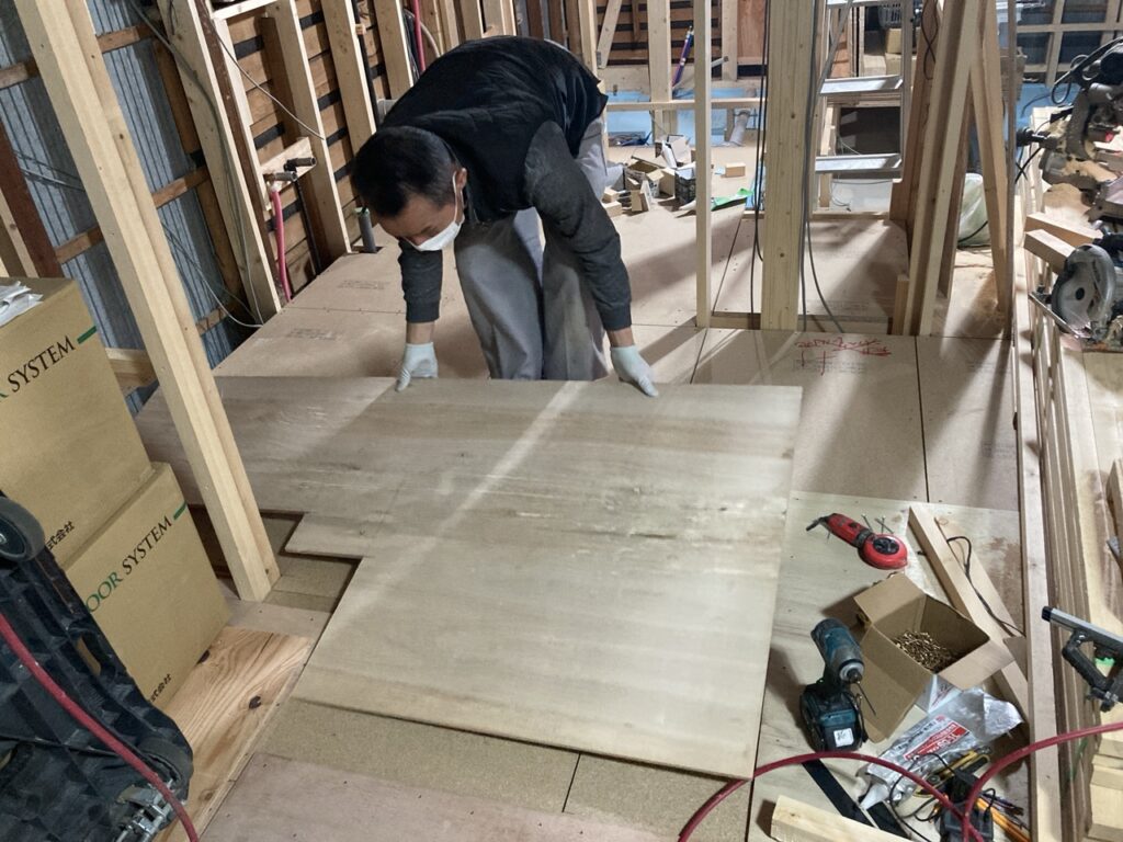 それが終わると仕上げとなり、C様邸ではフローリングやフロアタイルを取り付けていきます。