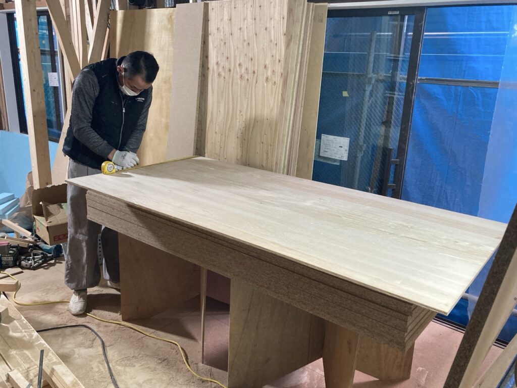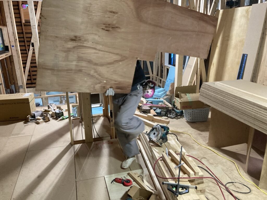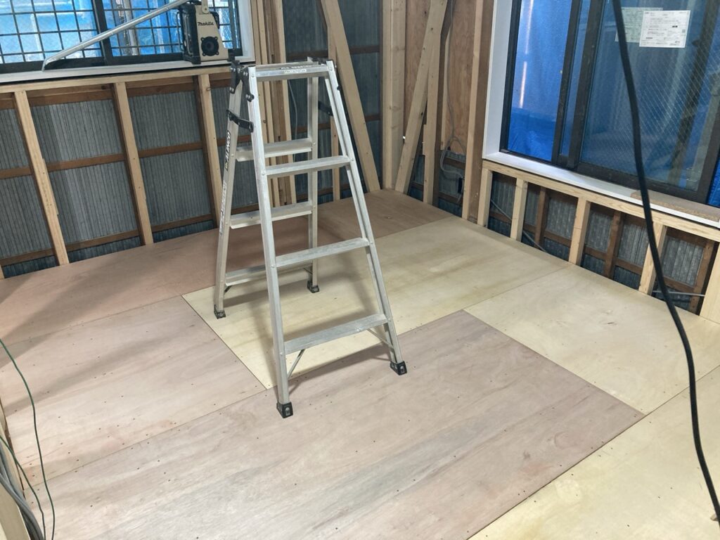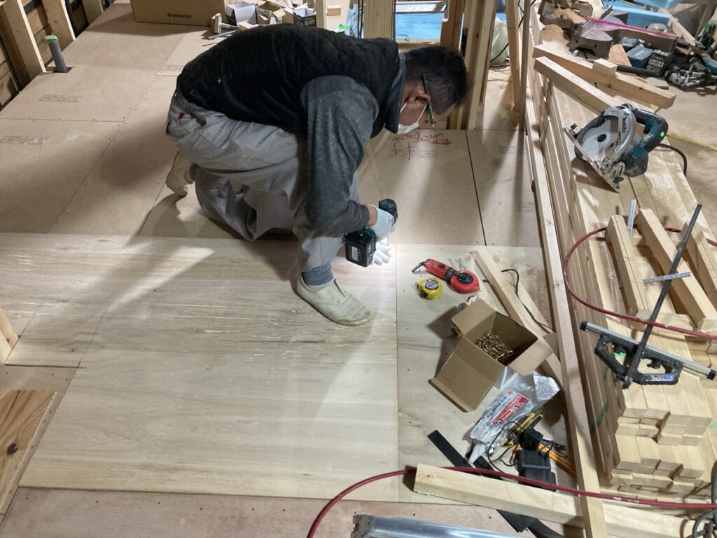 前回のブログで二重床施工の様子をご紹介しましたが、引き続き床の施工が続いています。今回は、前回取り付けたパーティクルボードの上にベニヤ板を付けていきます。