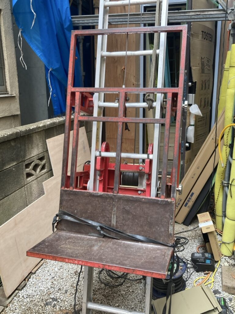 屋根の材料を上げたり、既存の屋根に使われていた古い資材を下ろしたりするのに使います