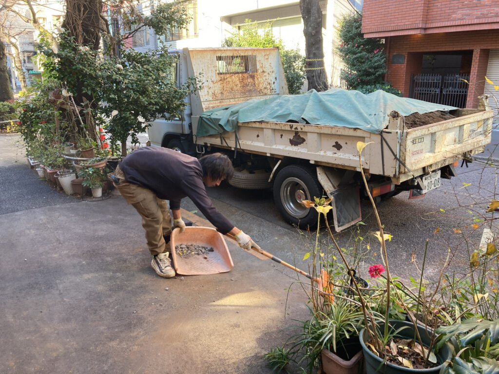 今回は、そのようにして整えた地面の土の上に、砕石を敷き詰めていきます。