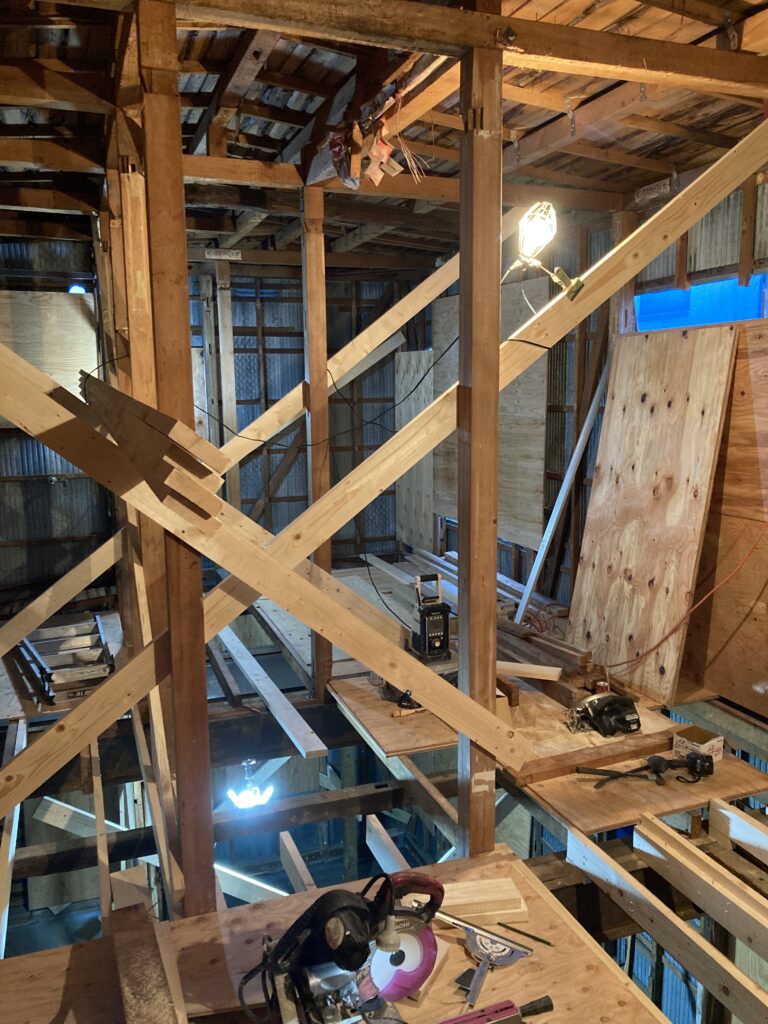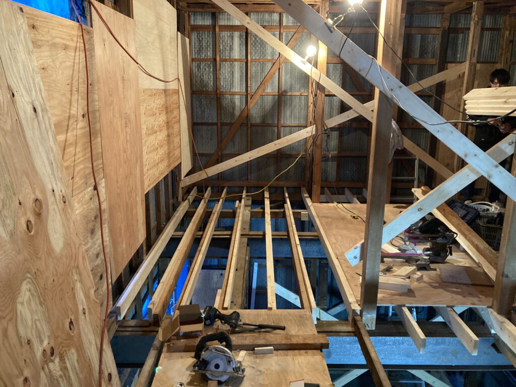 根太組が終わると次に床合板を張って、床が完了します。