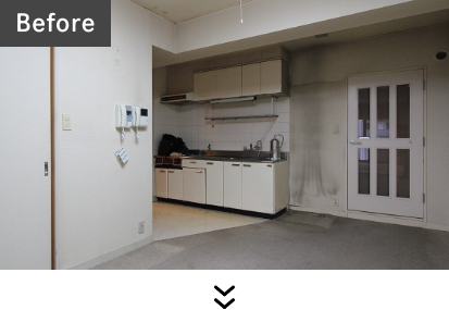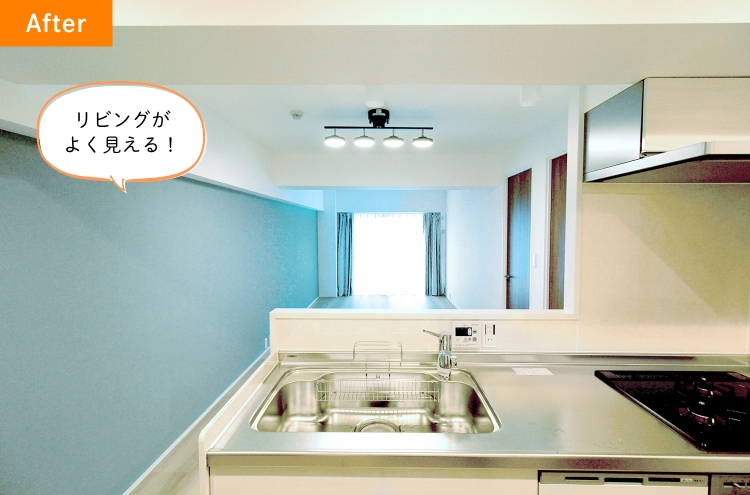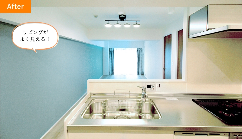 壁付けキッチンを、料理をしながら小さい子どもの様子が見れる対面式キッチンに変更。小さいお子様がいるため防音に配慮しLDKの床を二重床に。そのことを利用し、水道配管を床下に通しました。