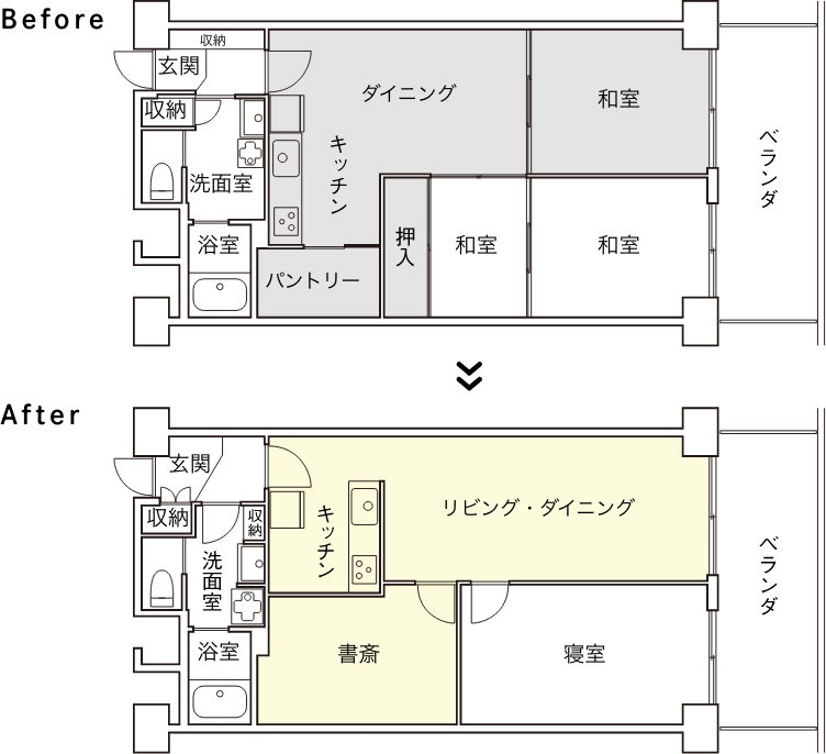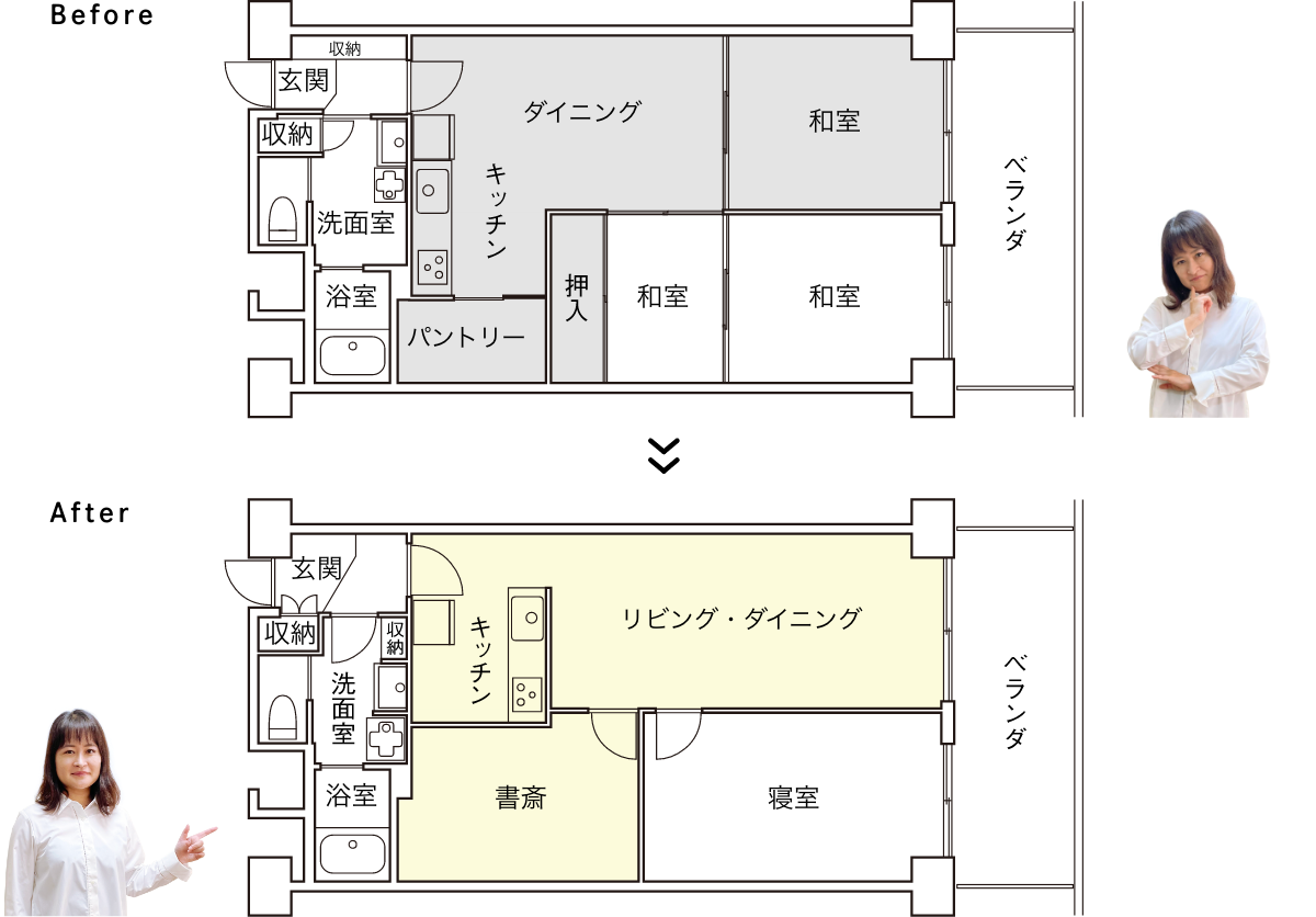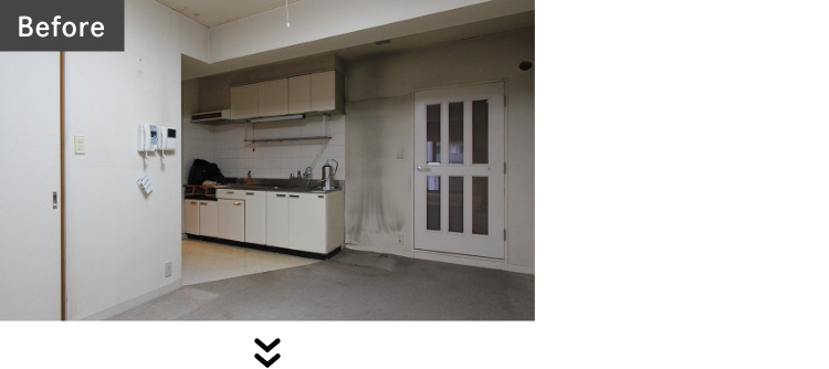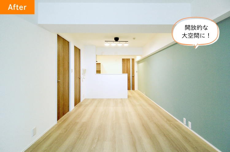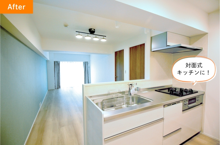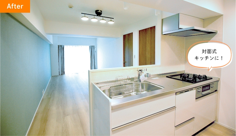 キッチン床を二重床にし、キッチンをリビングダイニング側に移動。対面式キッチンに変更するとともに、ダイニングと和室の間仕切りをなくし一部屋に。キッチンからリビング全体を見渡せる広々空間にリノベーション。料理中もリビングダイニングを見渡せ、家族とコミュニケーションを取りやすい間取りになりました。