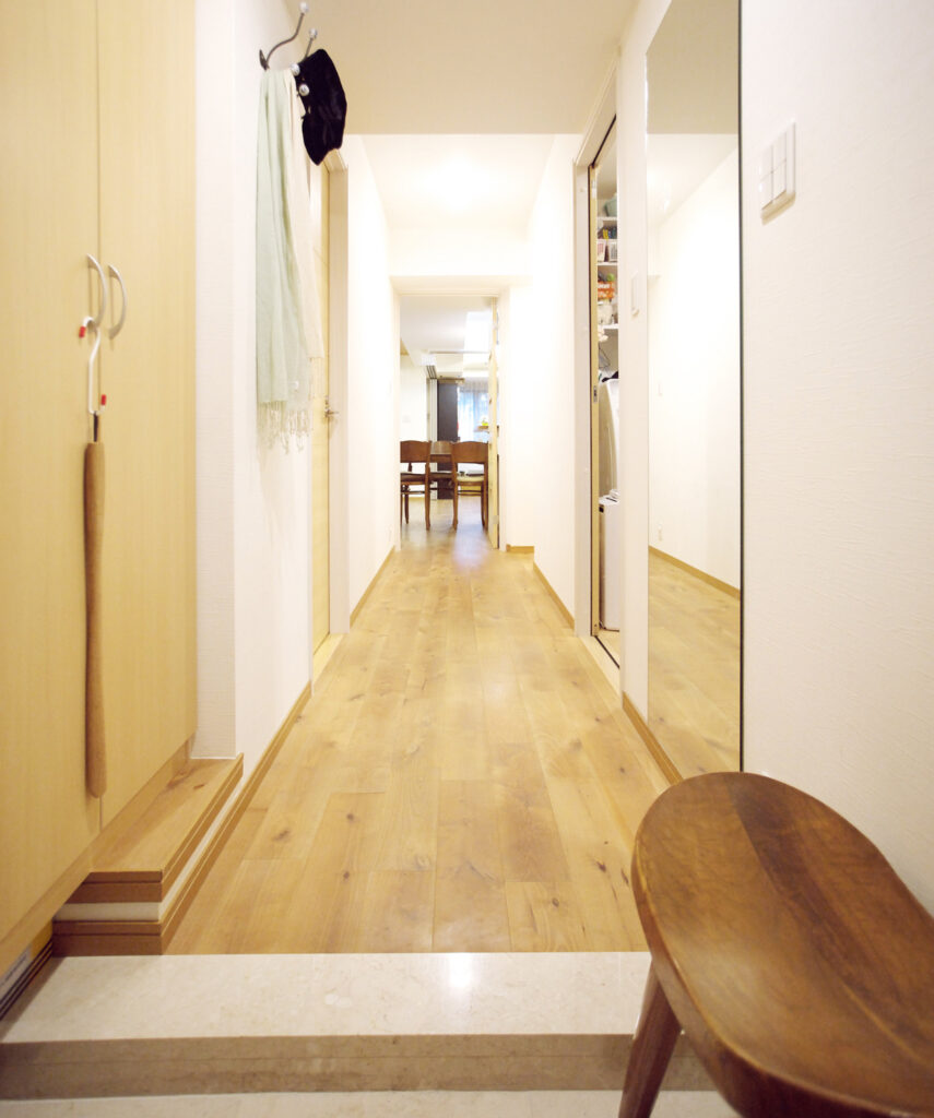 ▷ 外から帰ってきたとき、コートや帽子をかけるフックを設置!土間と廊下にまたがっら玄関収納は室内用、室外用の使い分けができて便利。