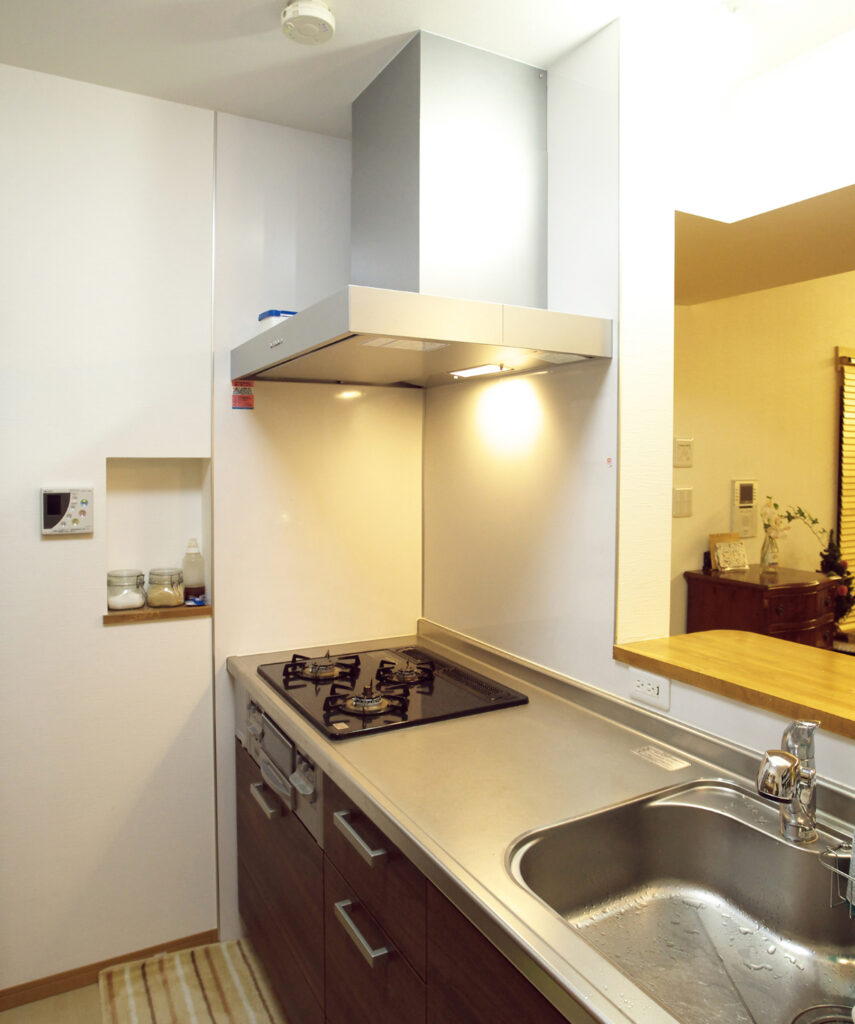 ▷ 料理中の臭いや排気に配慮し、ガスコンロ前にあえて壁を造作。