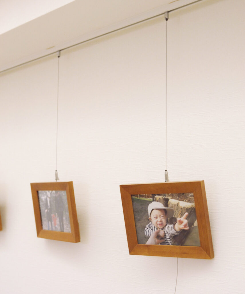 ピクチャーレールをあらかじめ設置しておくと壁に穴をあけることなく、旅行の写真や七五三や入学式などの記念写真、お子様の描いた絵などを気軽に簡単に飾れます。M様邸では思わず微笑んでしまう、お子様の写真がたくさん飾られています。このように子育て中のご家庭、写真や絵画の趣味のある方にオススメです!